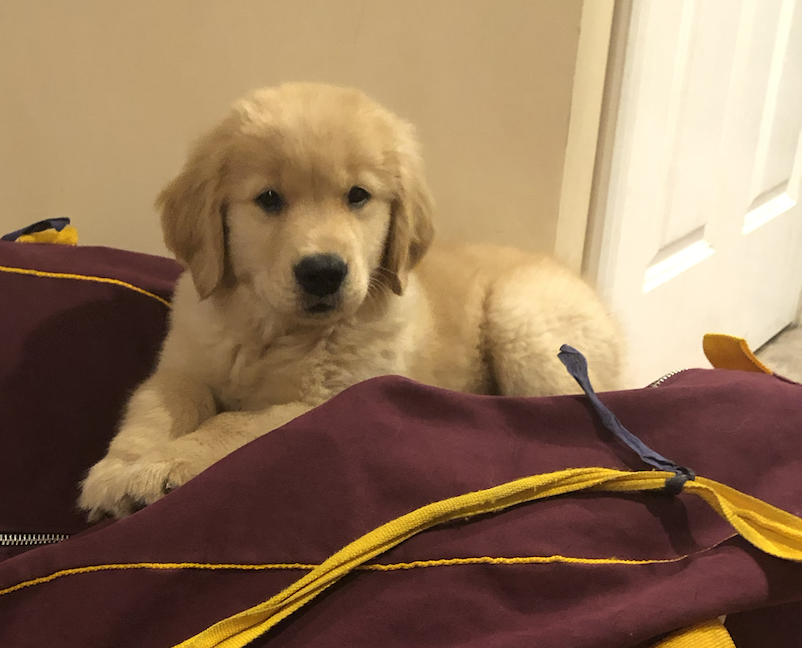 Left photo: My childhood dog, Hunter. Right: A puppy photo of my current dog, Finnegan, on my hockey bag.