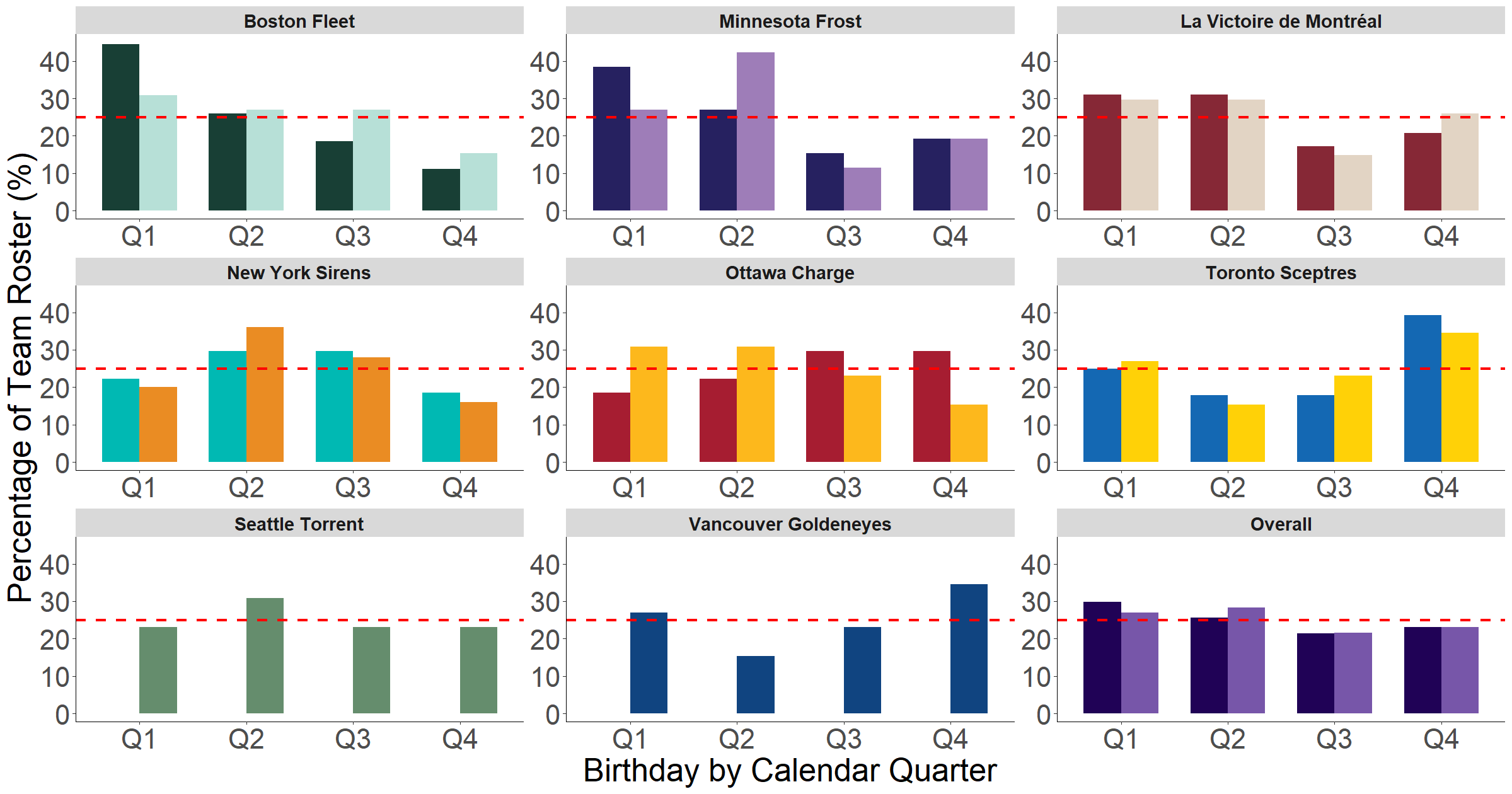 In Figure 2, we break the data down by team, with the caveat that the expansion teams only have 2025-26 rosters and that players are attributed to the receiving team in the case of trades. The Boston Fleet represent the most compelling case of the RAE in action, while the Toronto Sceptres seem to favour later birthdays instead. But all things being considered, fluctuations between birth quarters and variation between teams appears to be quite random.