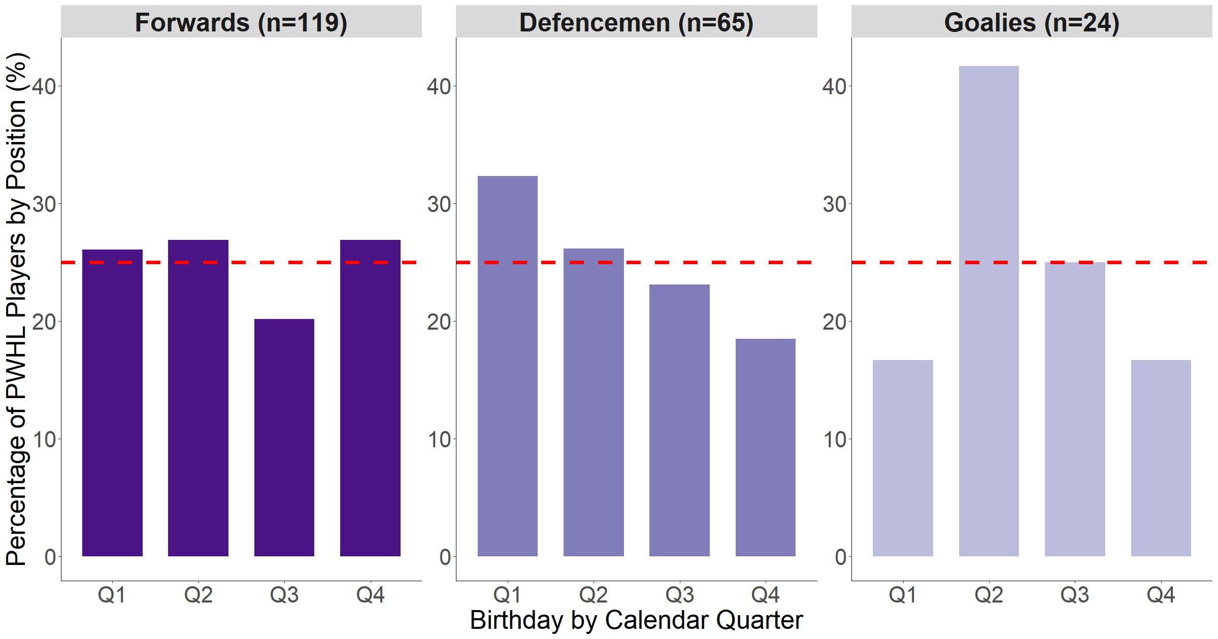 An analysis of data from the Swedish Ice Hockey Association concluded that the RAE was present in women’s youth hockey in Sweden, but the effect varied by position.2 A study on the Canadian women’s national teams, spanning 1998 to 2009, also reported evidence that the RAE depends on position.3 Additionally, the strength of the RAE across sports might differ by age group (more apparent in youth when developmental disparities are more pronounced) and gender (more apparent in boys/men), as was found in research involving European female soccer players.4