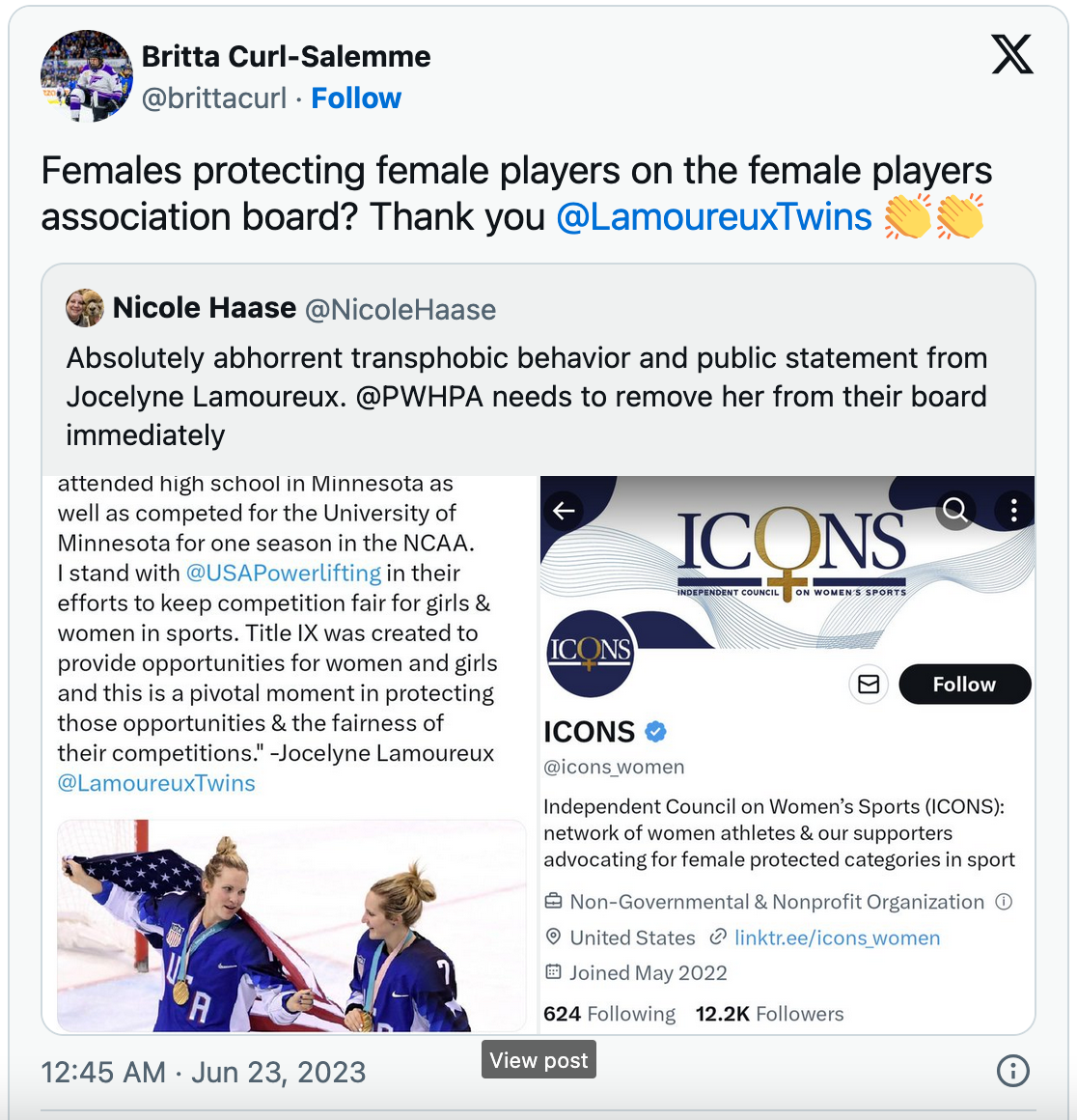 Instead of releasing literally anything about the gender inclusion policy we have been promised since before the inaugural puck dropped, this is what they’re doing. Not working to advocate for the trans community, not ensuring that trans people have their rightful places in sport, but attempting to make a transphobe look good. This is the league wanting to be the most progressive in the world? I think not. They're more interested in protecting a player's image than they are in having the hard conversations. Also, let's be honest: if Curl-Salemme was anything other than a conventionally attractive white woman, she'd have been left to the wolves instead of being coddled by both Salvian and the PWHL.