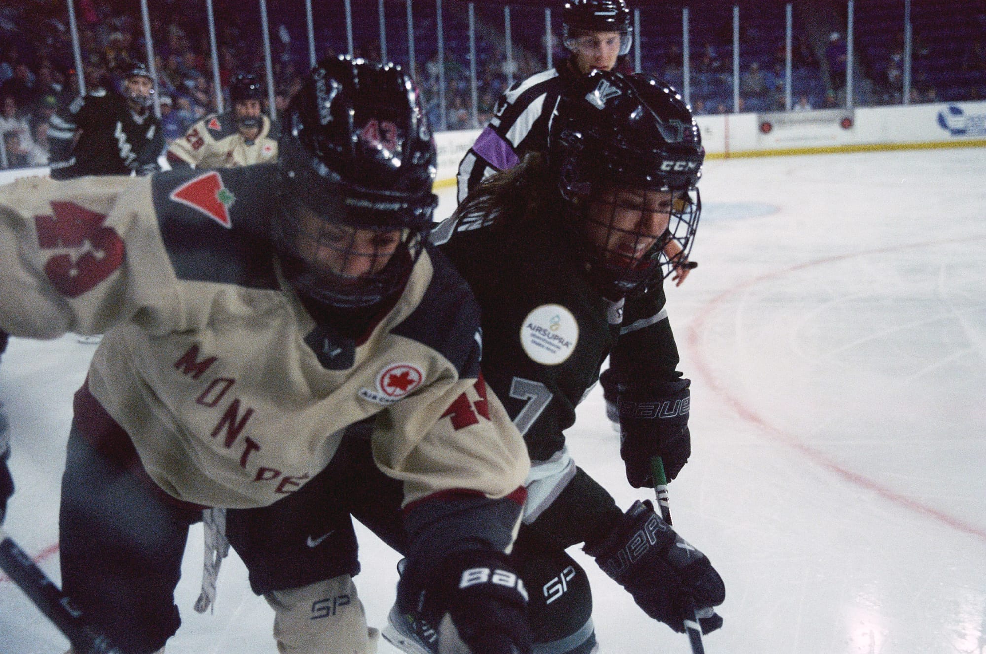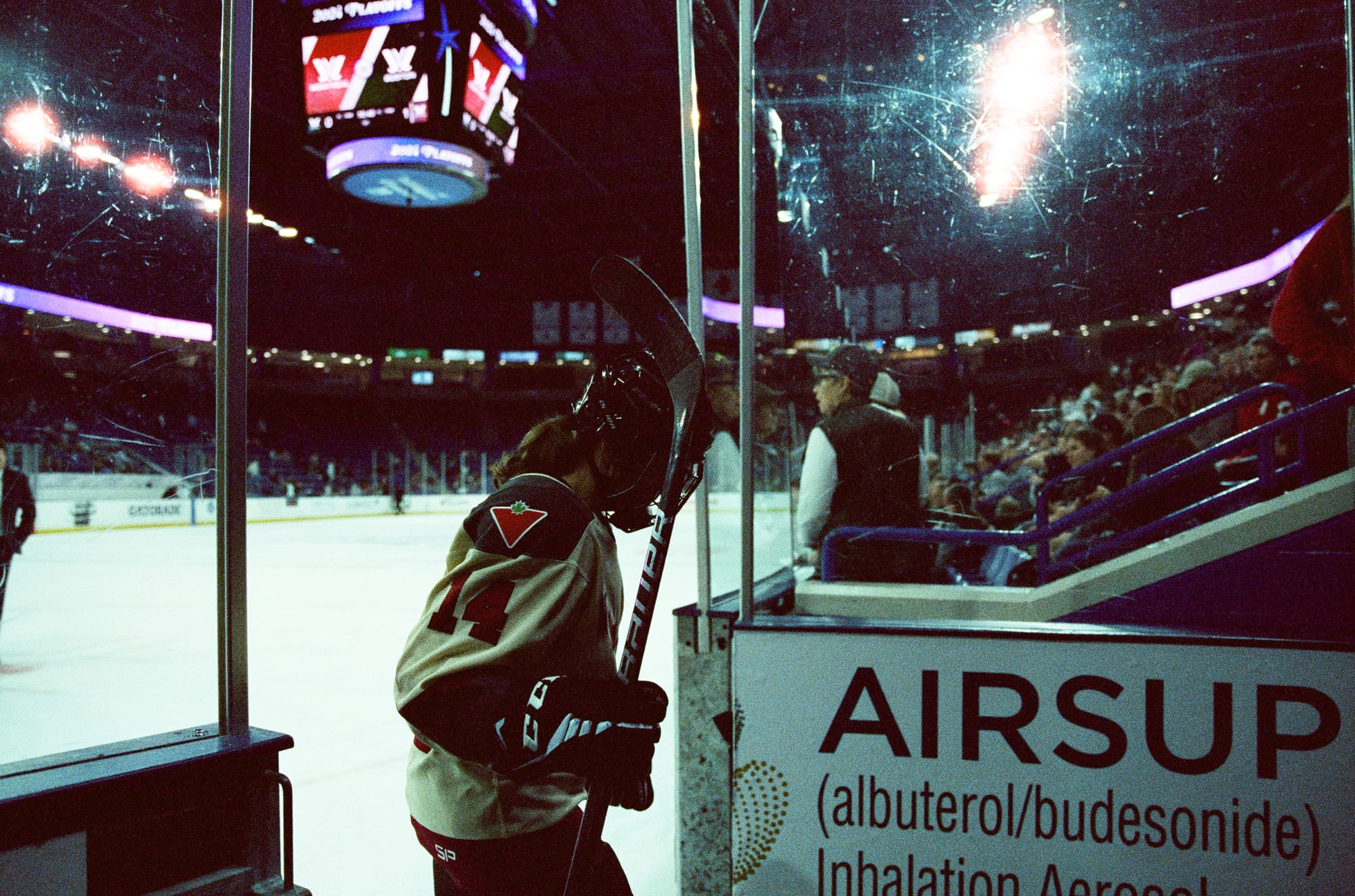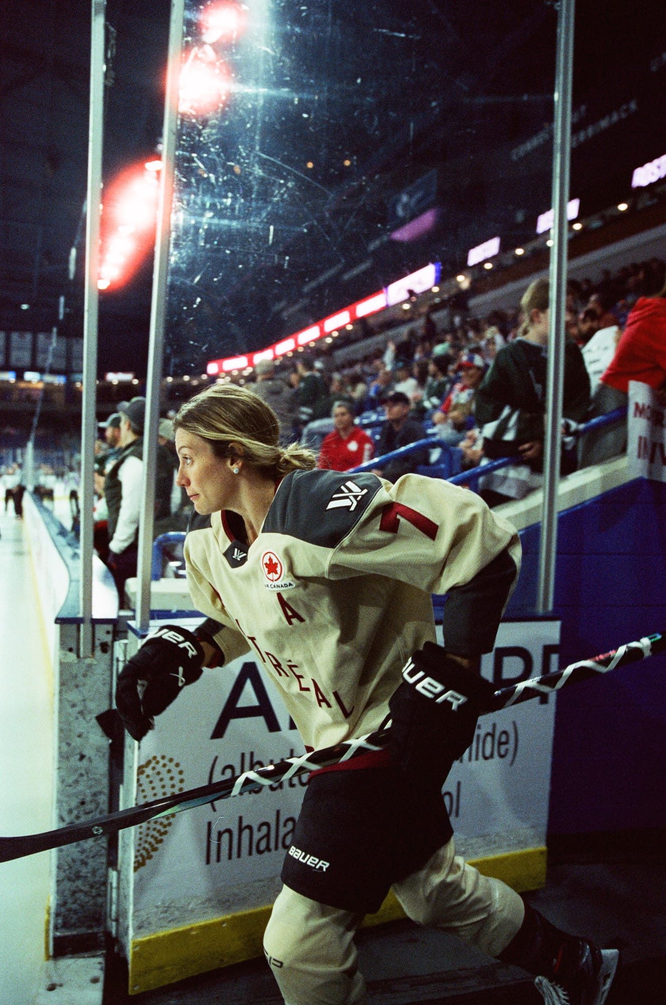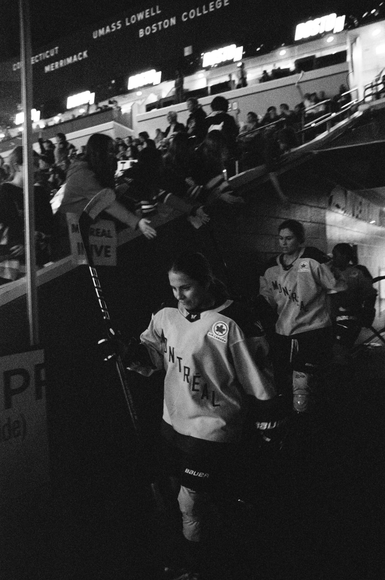 I admittedly wasn't as successful this time as I was the last time I shot a game on film back in February. This time I was at ice level and contending with shooting through the glass as opposed to over it. I had some metering issues plus the extra distortion/lack of sharpness from the thick glass. But it is also the corner where PWHL Montréal takes the ice, and that made for off-ice moments I haven't gotten this season.