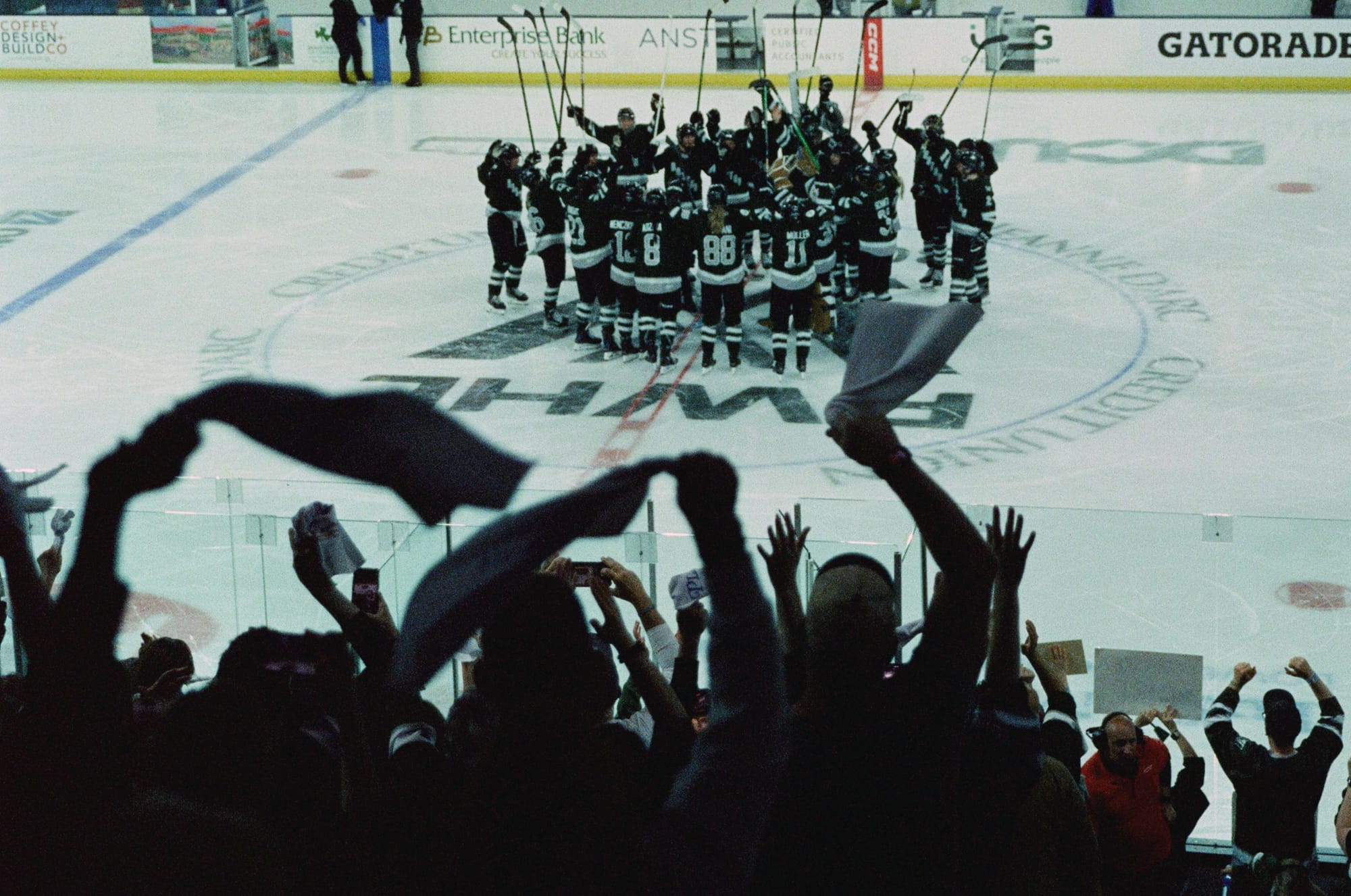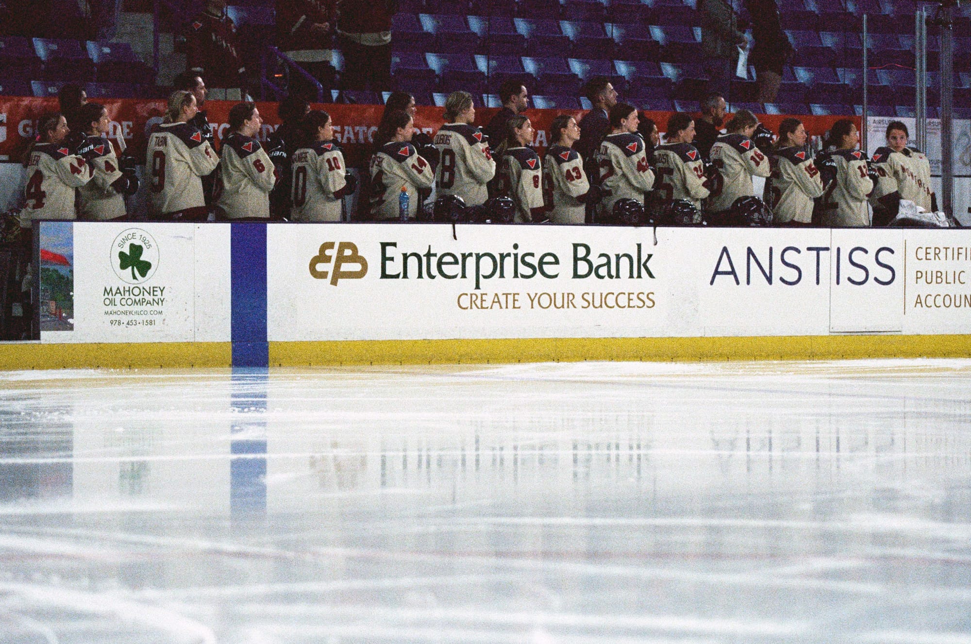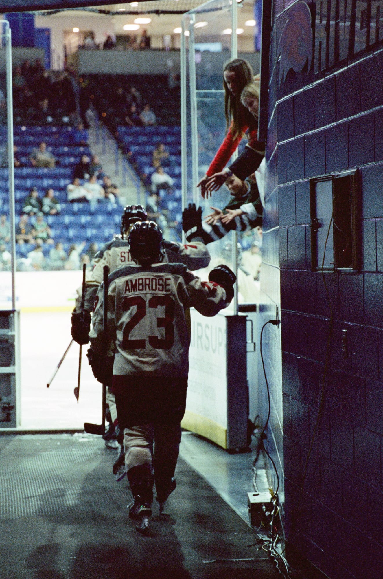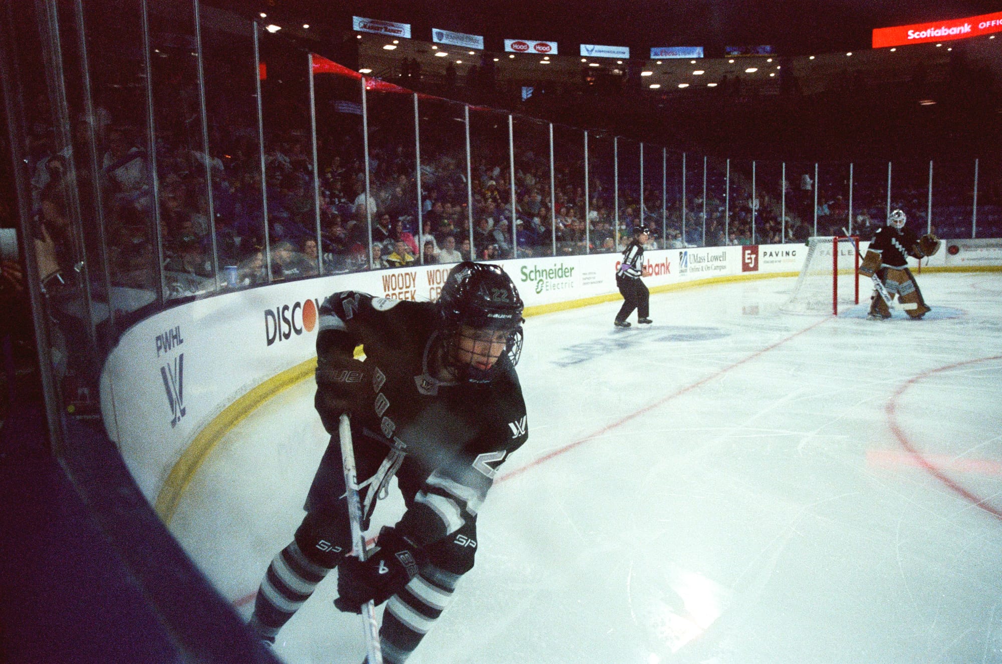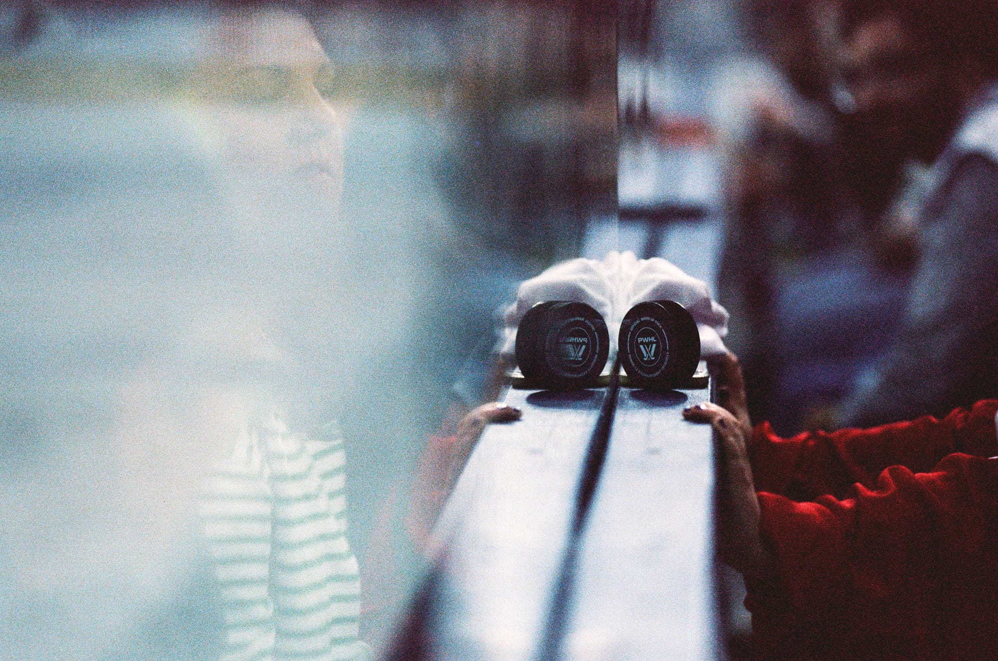 I admittedly wasn't as successful this time as I was the last time I shot a game on film back in February. This time I was at ice level and contending with shooting through the glass as opposed to over it. I had some metering issues plus the extra distortion/lack of sharpness from the thick glass. But it is also the corner where PWHL Montréal takes the ice, and that made for off-ice moments I haven't gotten this season.