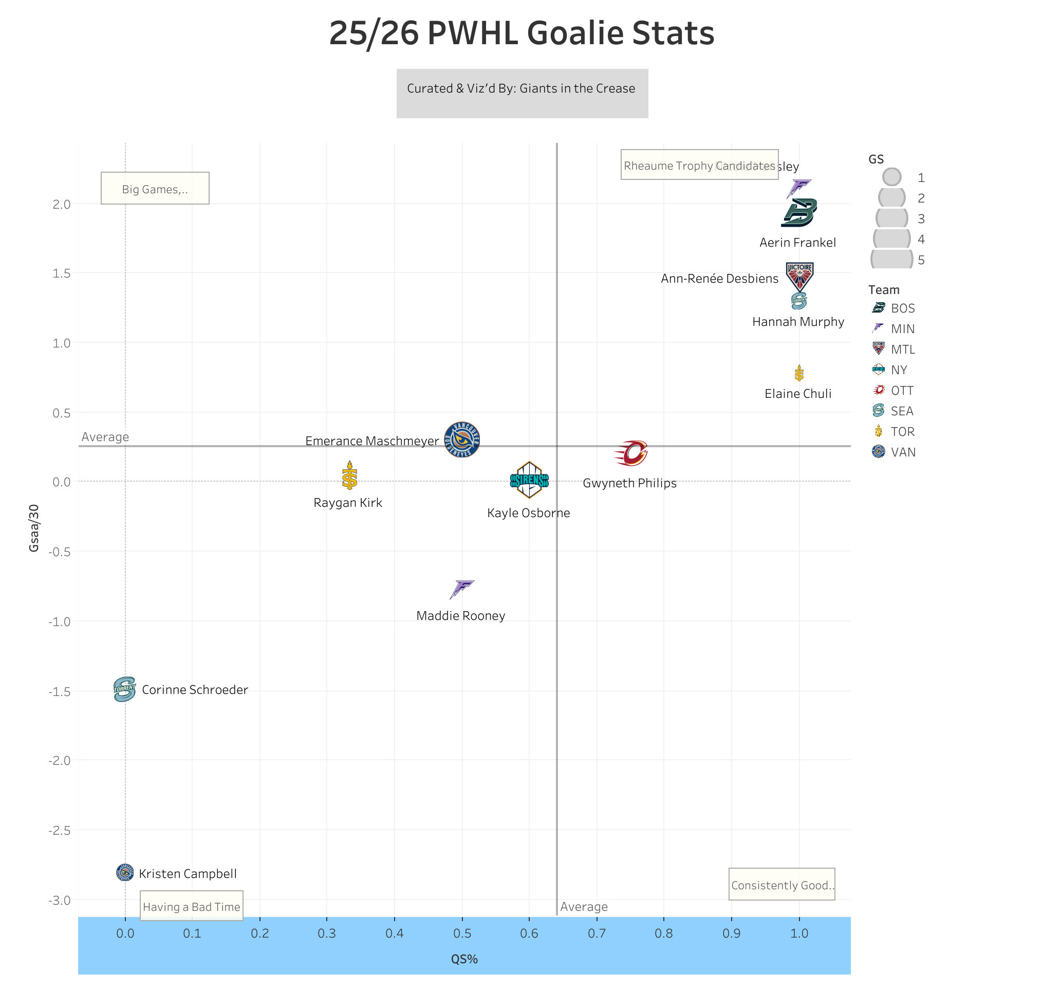 Combined, Frost goaltenders have a .942 save percentage, which is much better than last year's league-worst .902 mark. However, with Hensley's numbers likely to come down a bit at some point, The Frost will need more consistent play from Rooney to be successful. Rooney posted a .907 save percentage in 19 starts last season, and a .915 in 10 starts in 2024; her track record indicates her play will improve.