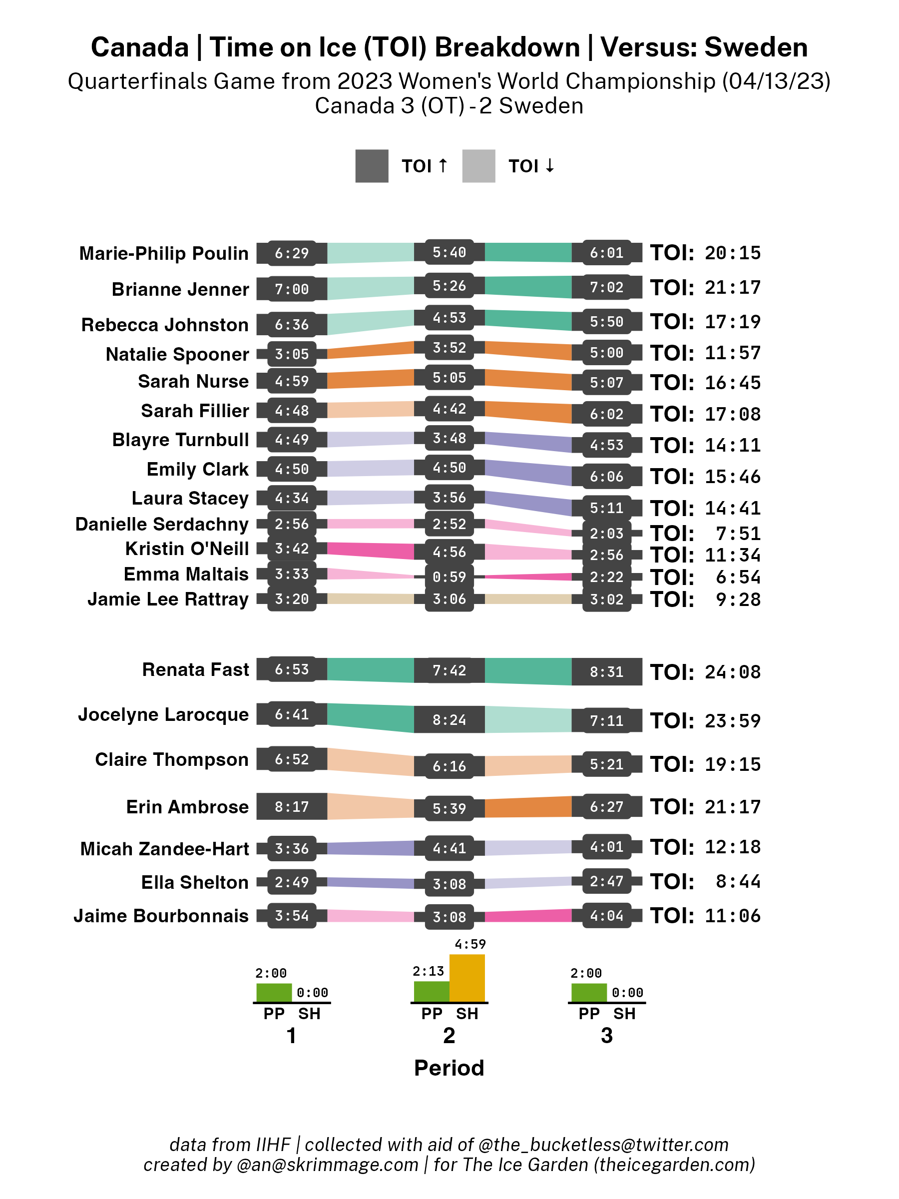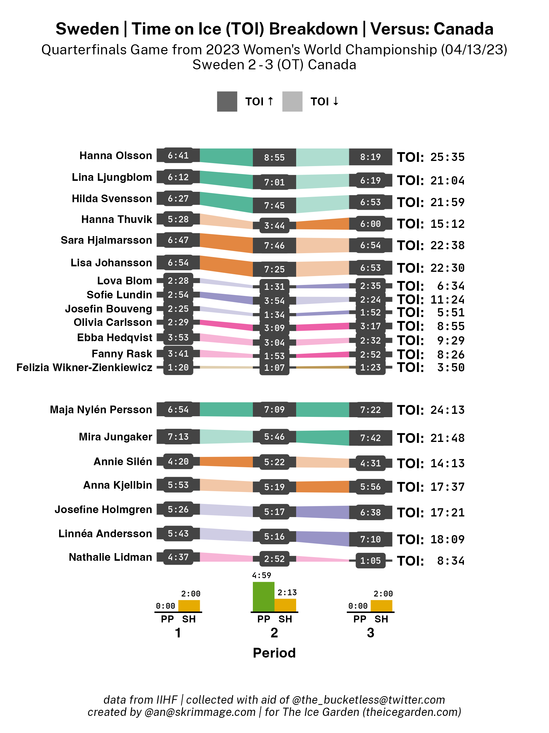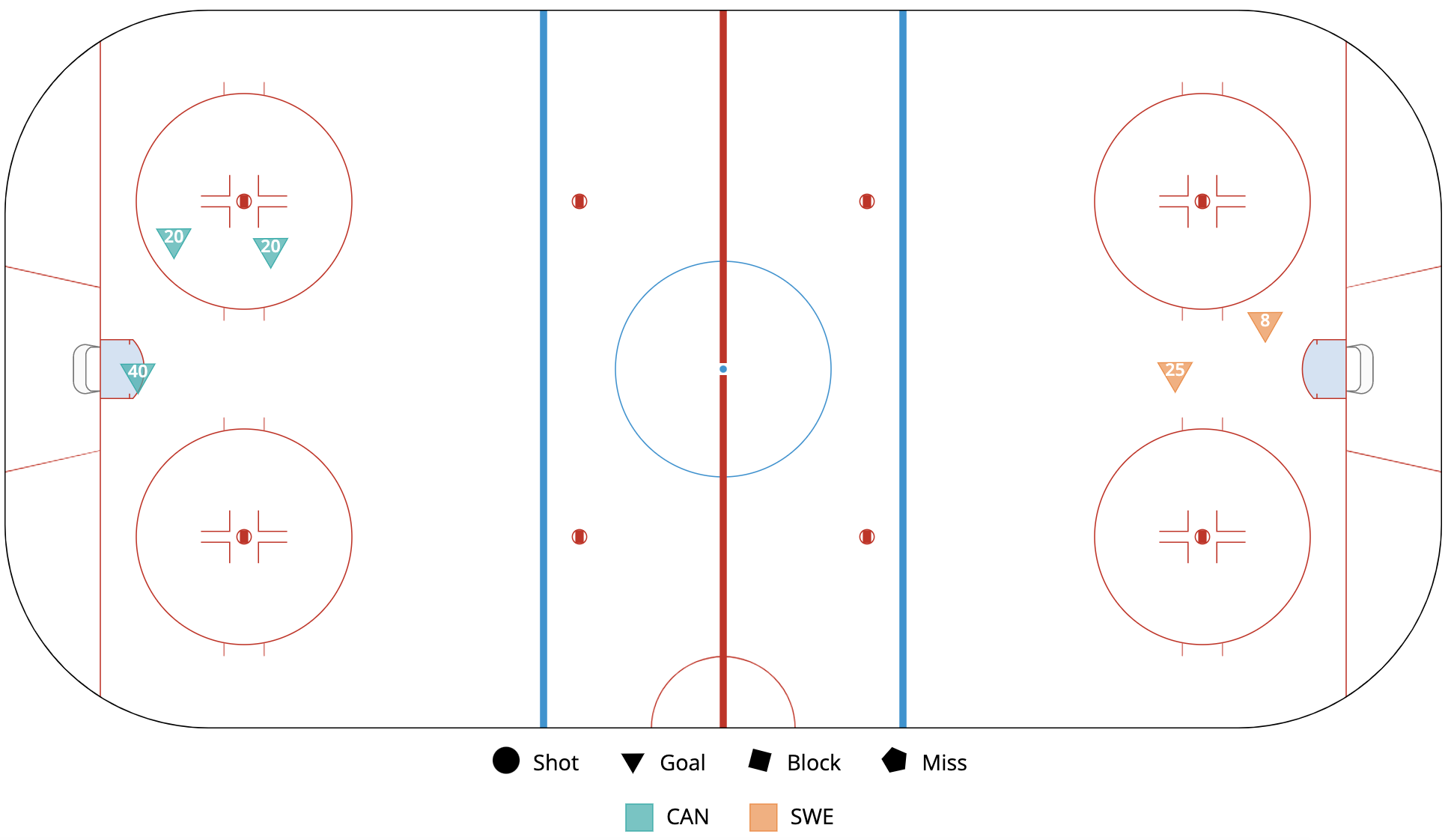 A shot attempt map for Canada versus Sweden in the 2023 Women's Worlds on April 13th, 2023.A shot attempt heat map for Canada versus Sweden in the 2023 Women's Worlds on April 13th, 2023.A shot attempt map for Canada versus Sweden, showing only the goals, in the 2023 Women's Worlds on April 13th, 2023.A time on ice breakdown Sankey chart for Canada against Sweden in the 2023 Women's Worlds on April 13th, 2023.A time on ice breakdown Sankey chart for Canada against Sweden in the 2023 Women's Worlds on April 13th, 2023.