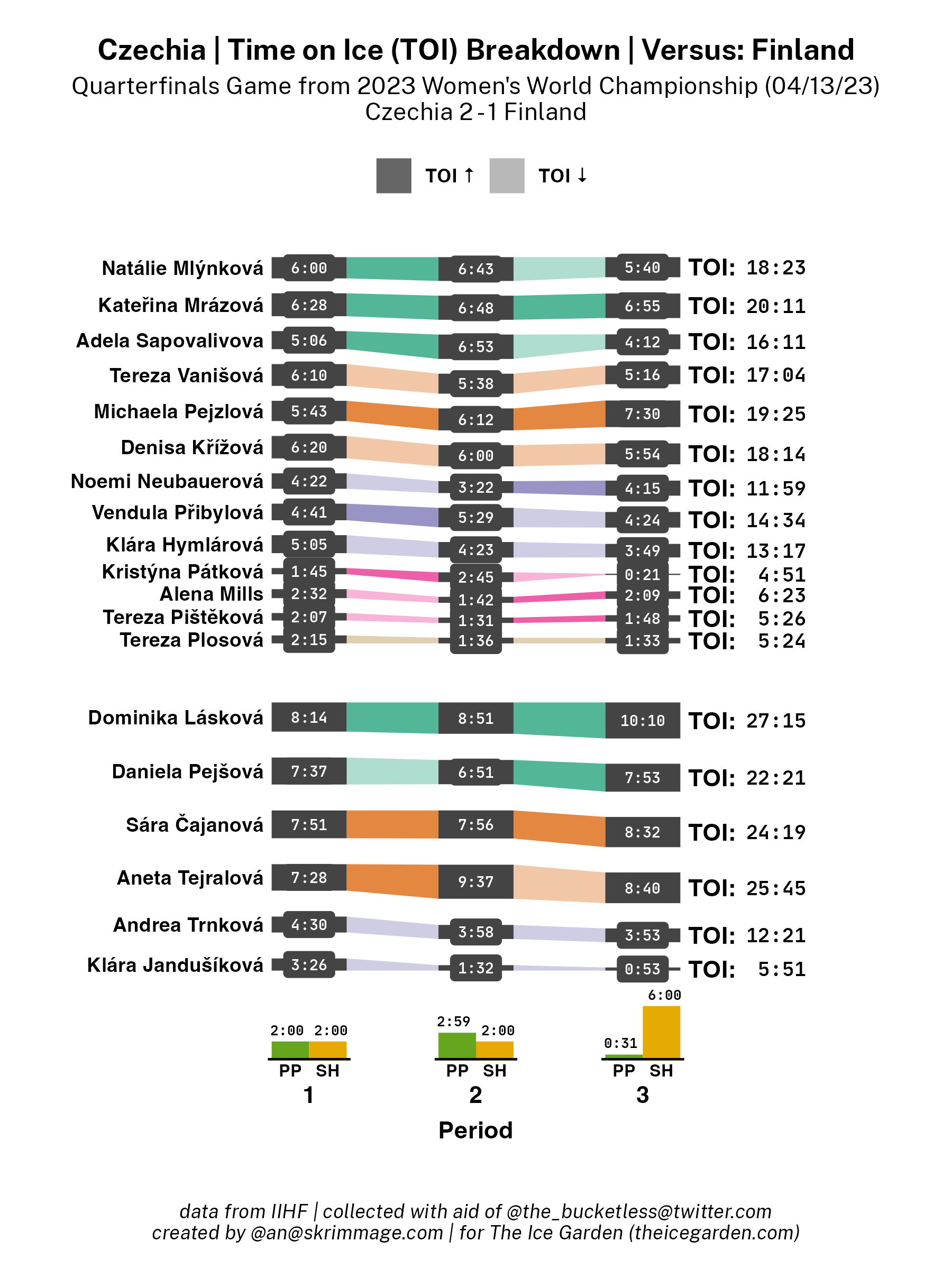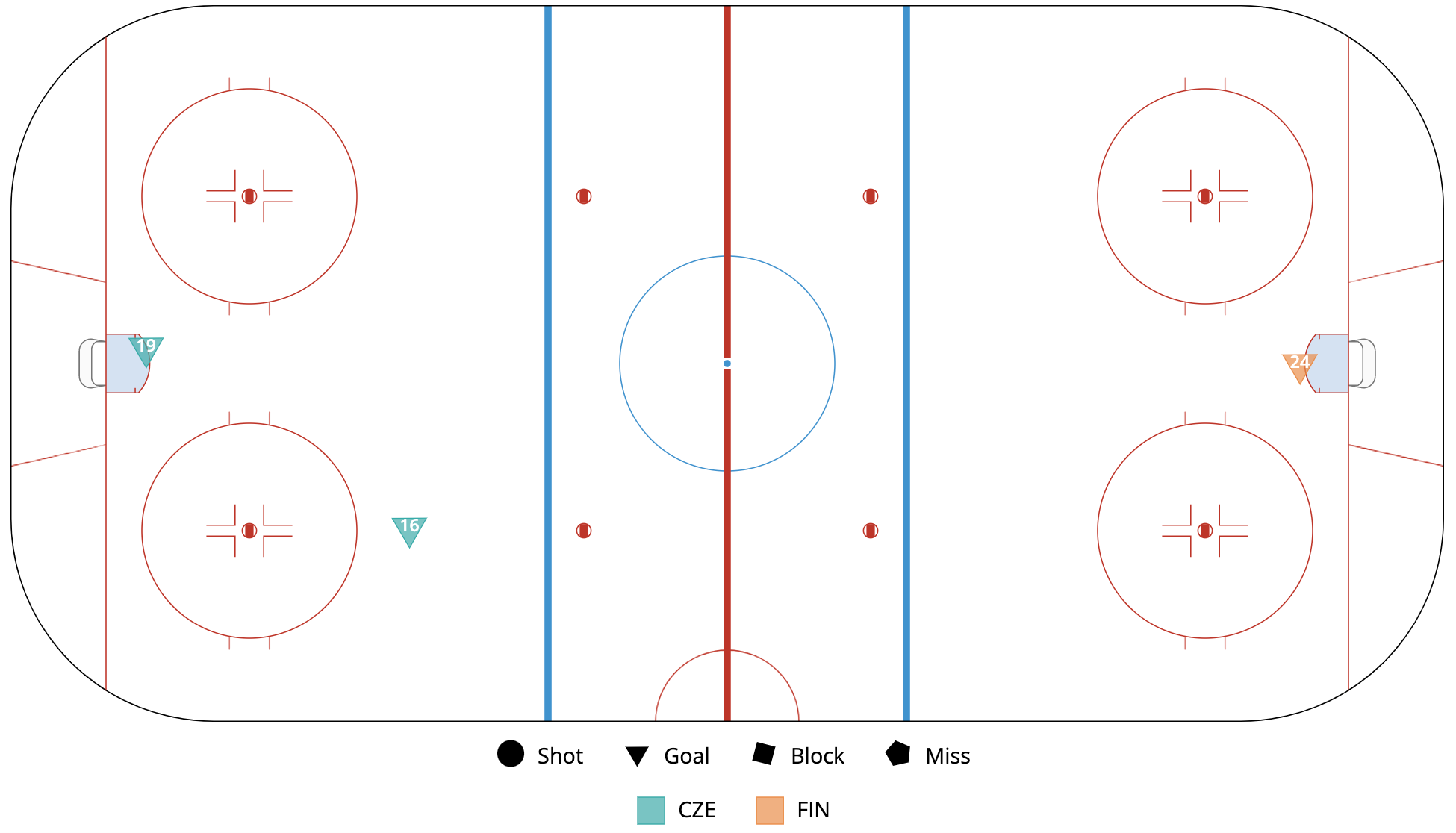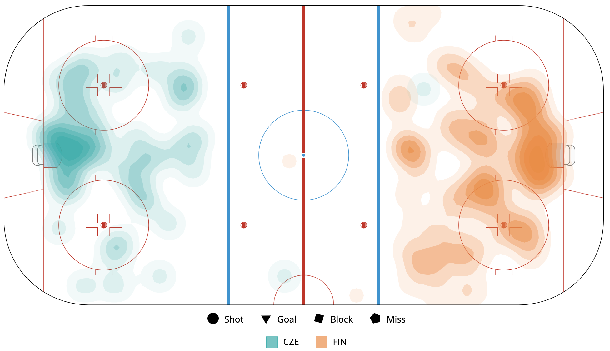 A shot attempt map for Czechia versus Finland in the 2023 Women's Worlds on April 13th, 2023.A shot attempt heat map for Czechia versus Finland in the 2023 Women's Worlds on April 13th, 2023.A shot attempt map for Czechia versus Finland, showing only the goals, in the 2023 Women's Worlds on April 13th, 2023.A time on ice breakdown Sankey chart for Czechia against Finland in the 2023 Women's Worlds on April 13th, 2023.A time on ice breakdown Sankey chart for Czechia against Finland in the 2023 Women's Worlds on April 13th, 2023.