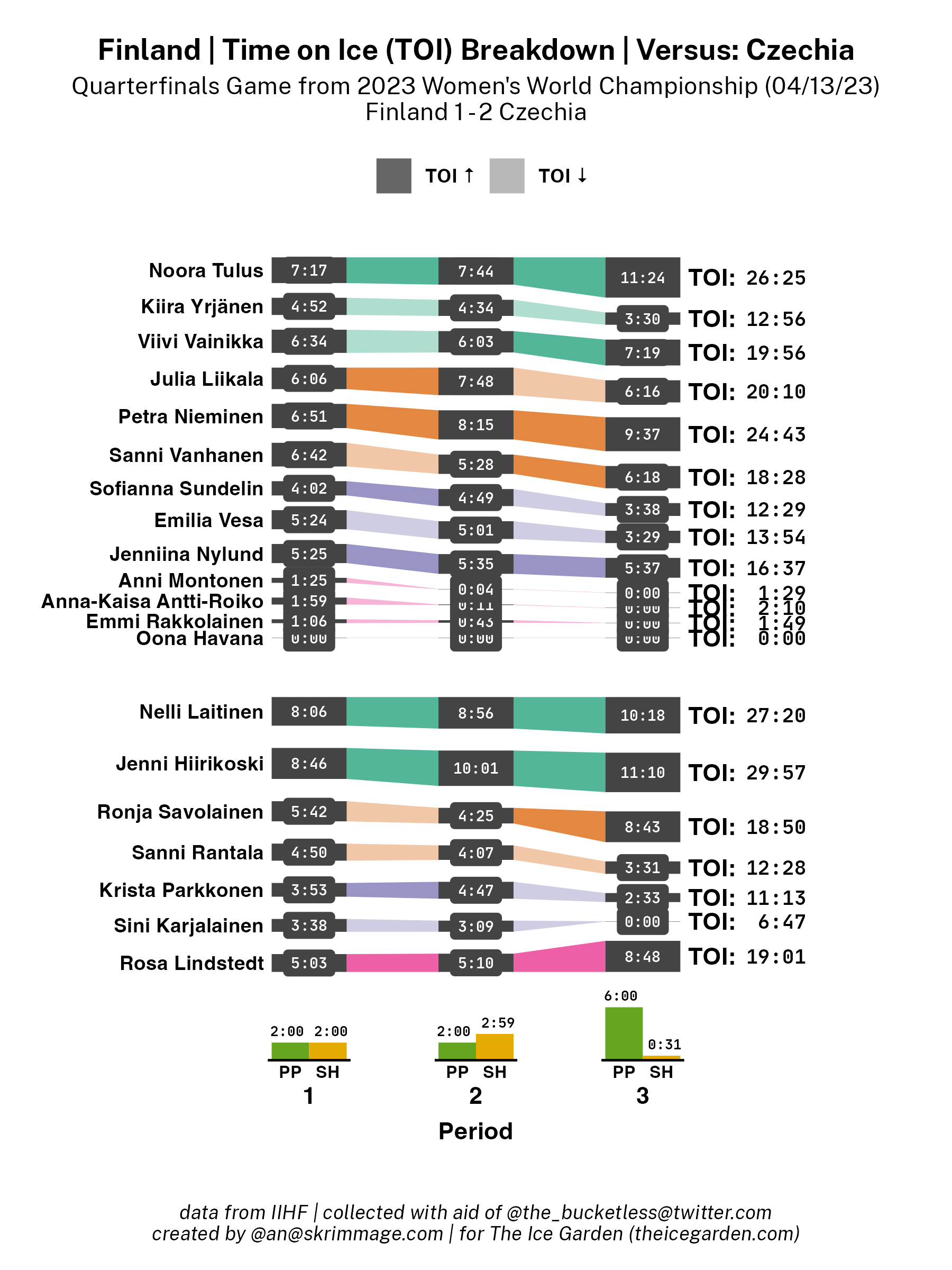 This is part of a series of recaps for every day of Women's Worlds, this one covering the games on April 13, 2023, exploring the stats of the game in data viz form (specifically: shot attempt maps with all shot attempts and with only goals, shot attempt heat maps, and time on ice breakdown Sankey charts). If you want some guidance on how to interpret these viz styles, check out my viz reference.