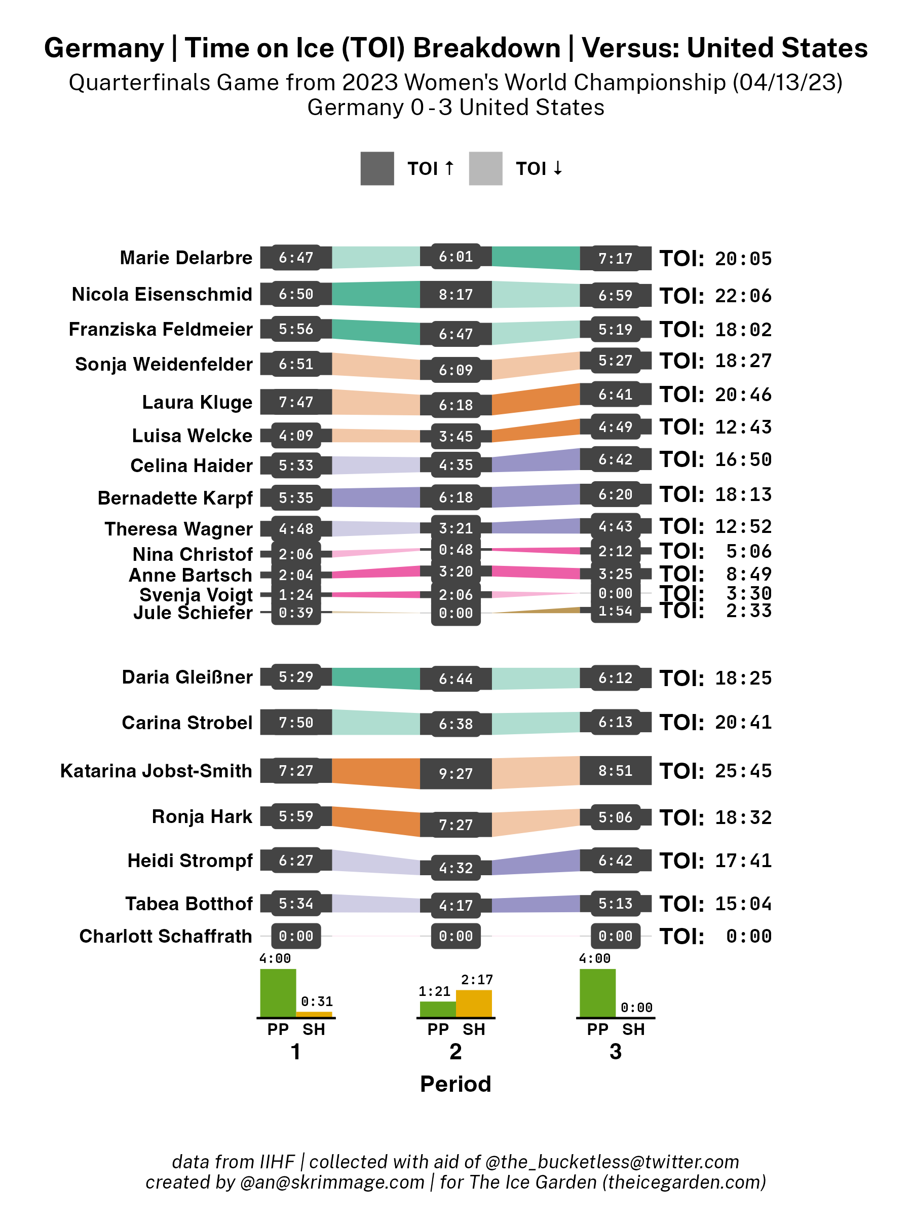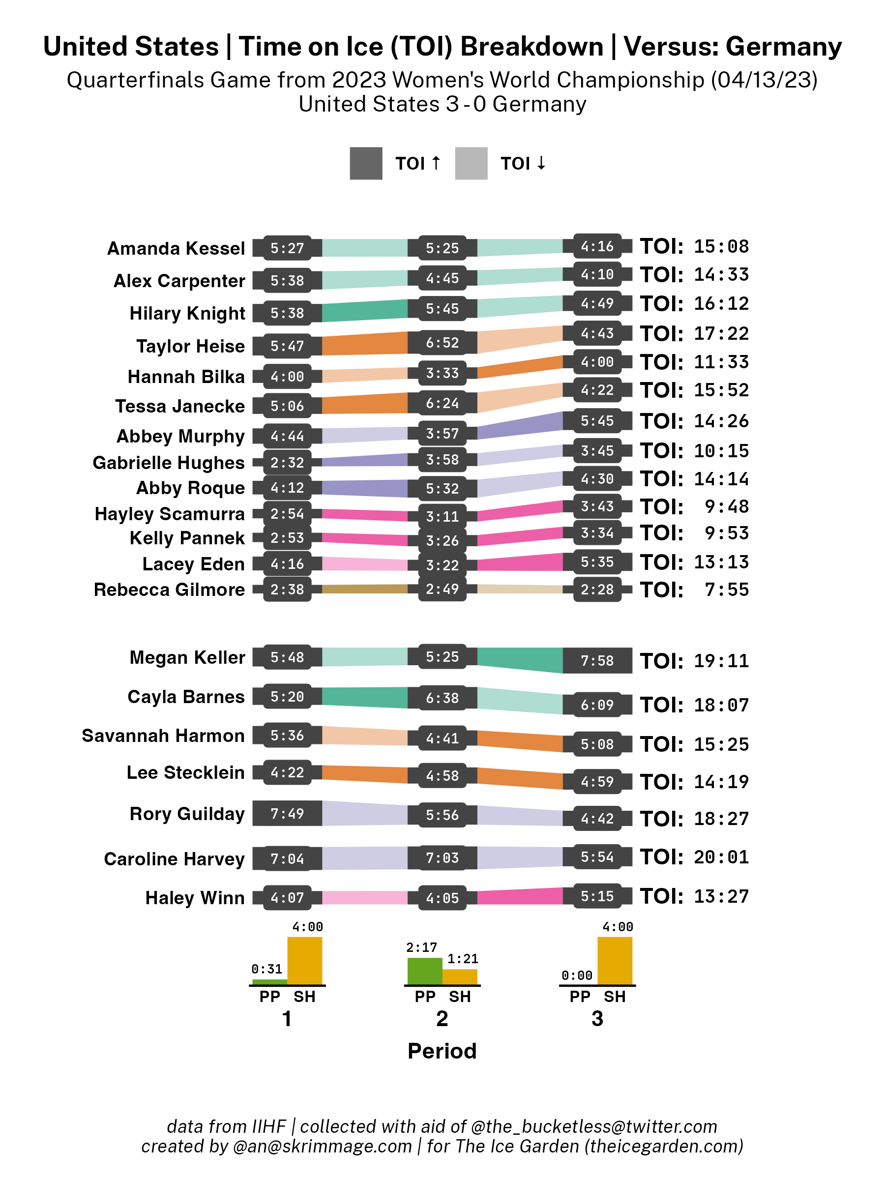 A shot attempt map for the United States versus Germany in the 2023 Women's Worlds on April 13th, 2023.A shot attempt heat map for the United States versus Germany in the 2023 Women's Worlds on April 13th, 2023.A shot attempt map for the United States versus Germany, showing only the goals, in the 2023 Women's Worlds on April 13th, 2023.A time on ice breakdown Sankey chart for the United States against Germany in the 2023 Women's Worlds on April 13th, 2023.A time on ice breakdown Sankey chart for Germany against the United States in the 2023 Women's Worlds on April 13th, 2023.