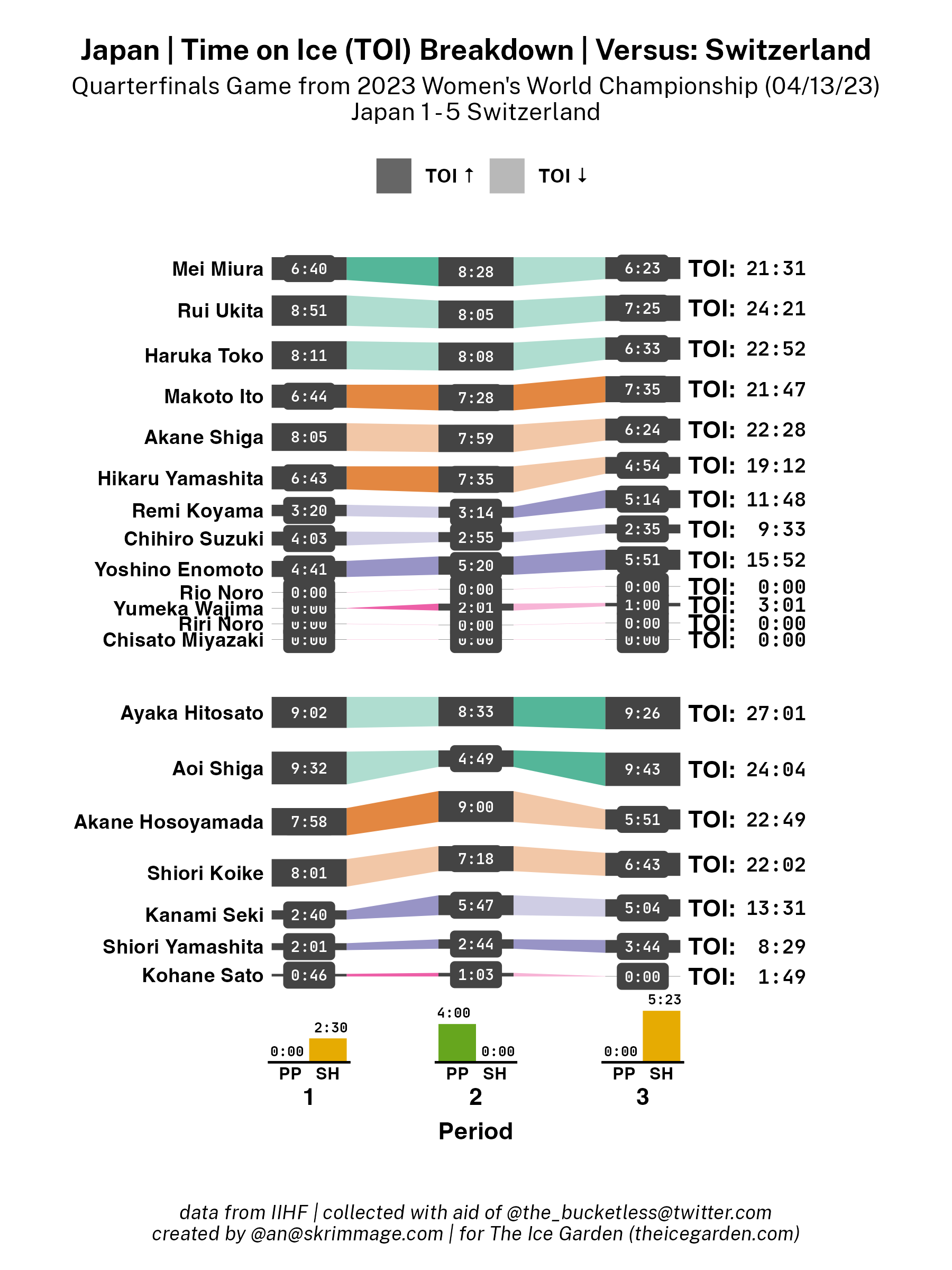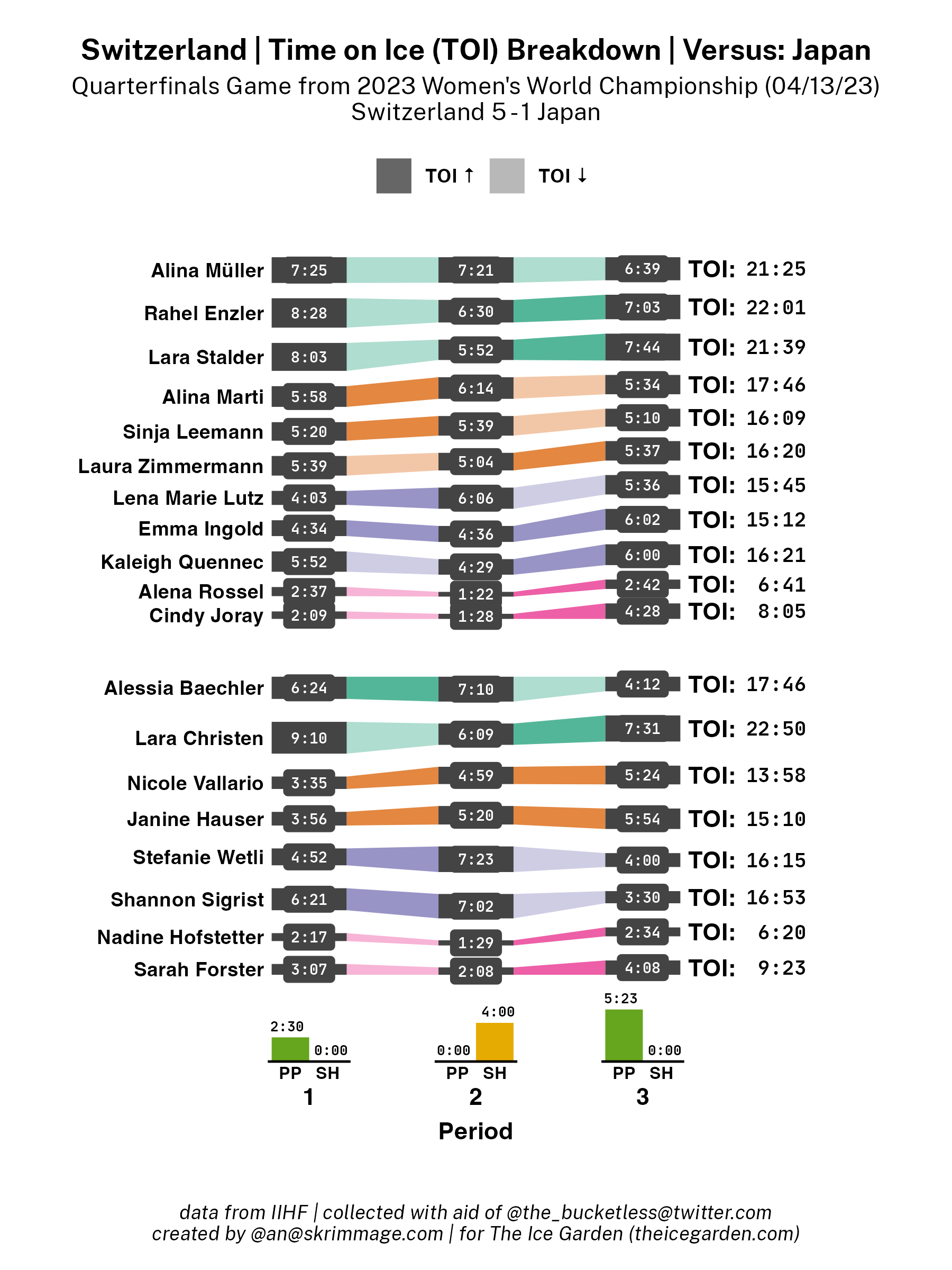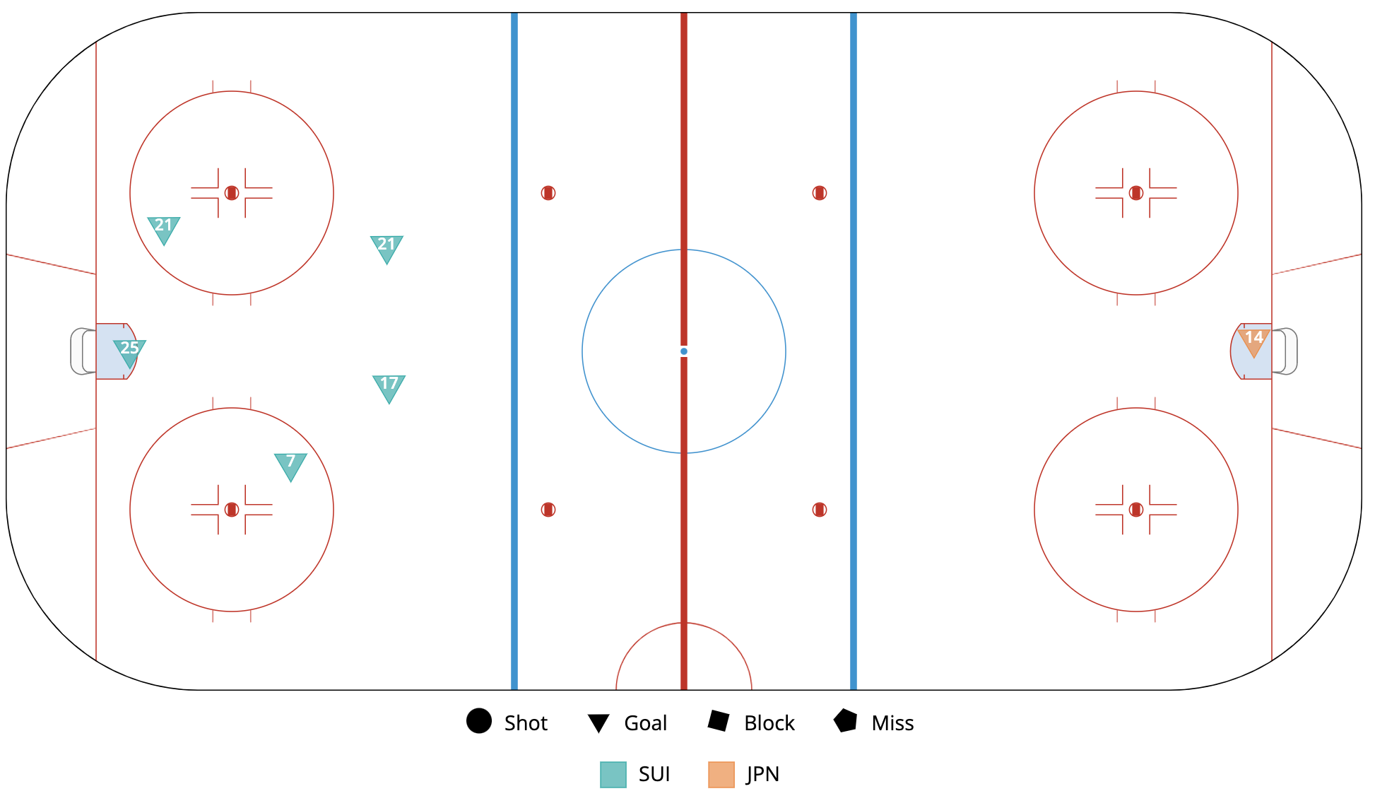 A shot attempt map for Switzerland versus Japan in the 2023 Women's Worlds on April 13th, 2023.A shot attempt heat map for Switzerland versus Japan in the 2023 Women's Worlds on April 13th, 2023.A shot attempt map for Switzerland versus Japan, showing only the goals, in the 2023 Women's Worlds on April 13th, 2023.A time on ice breakdown Sankey chart for Switzerland against Japan in the 2023 Women's Worlds on April 13th, 2023.A time on ice breakdown Sankey chart for Japan against Switzerland in the 2023 Women's Worlds on April 13th, 2023.