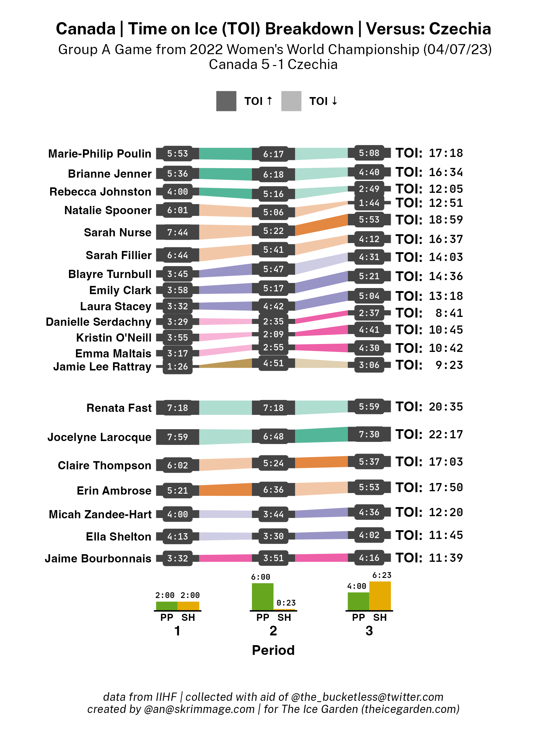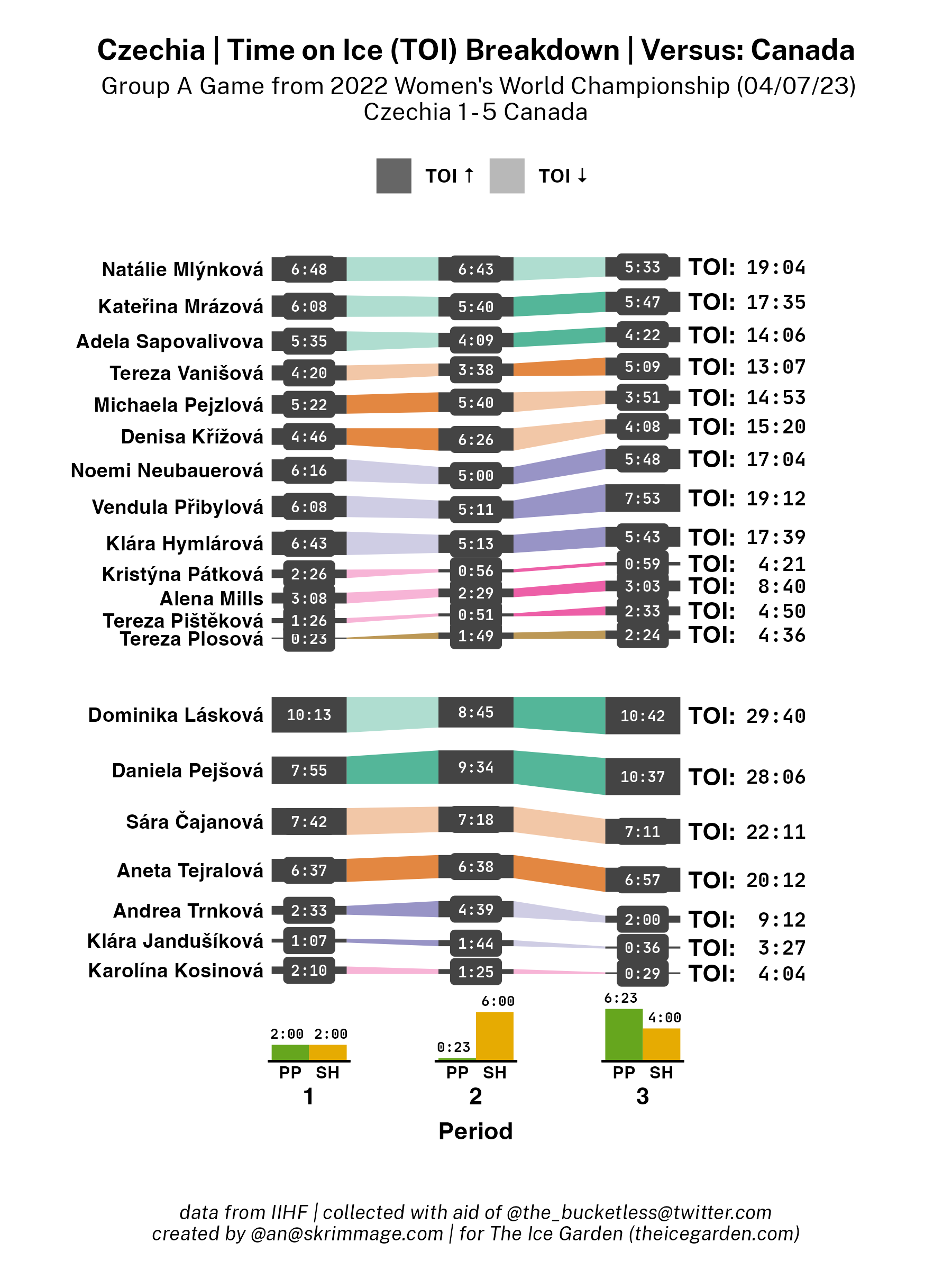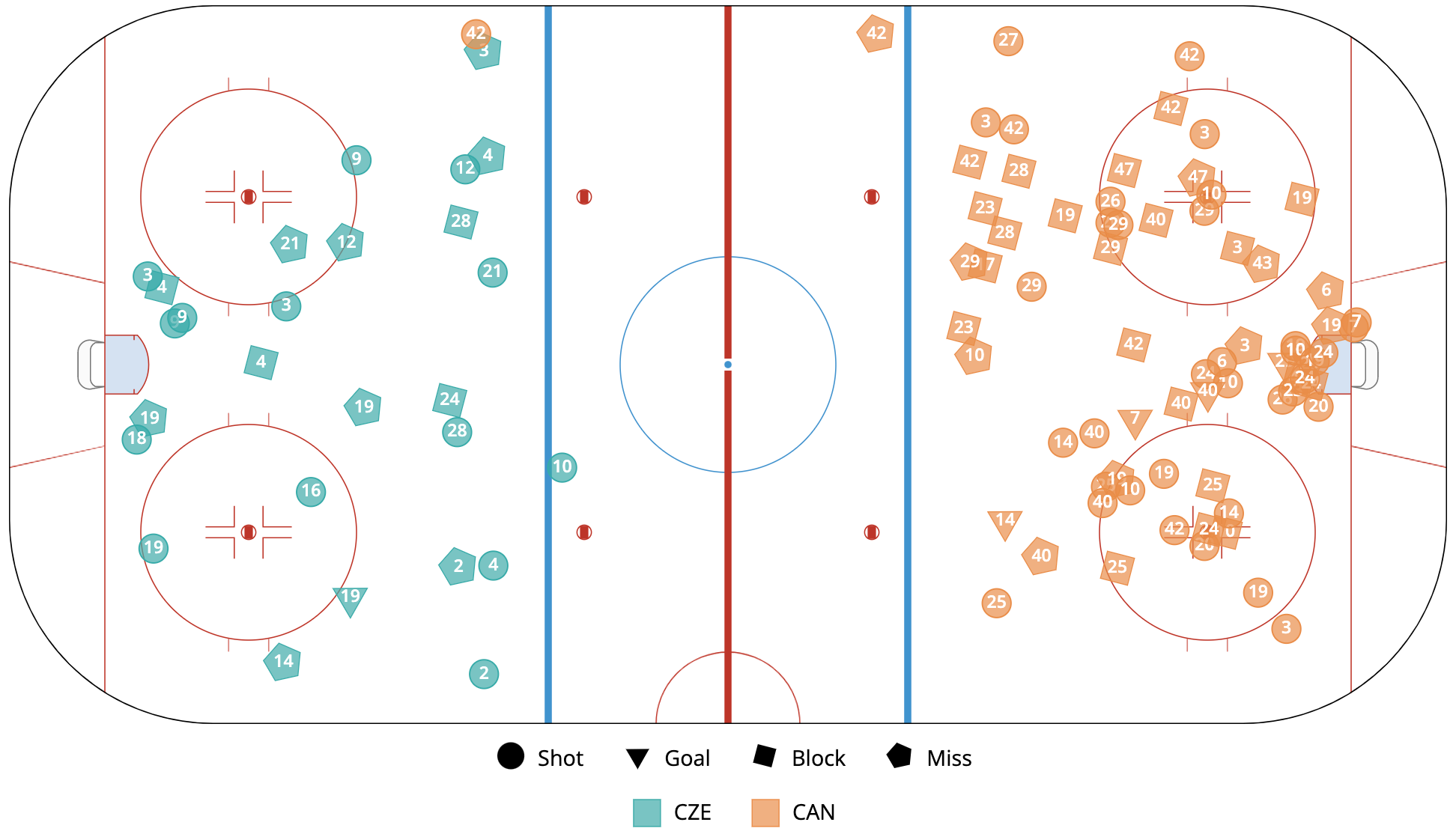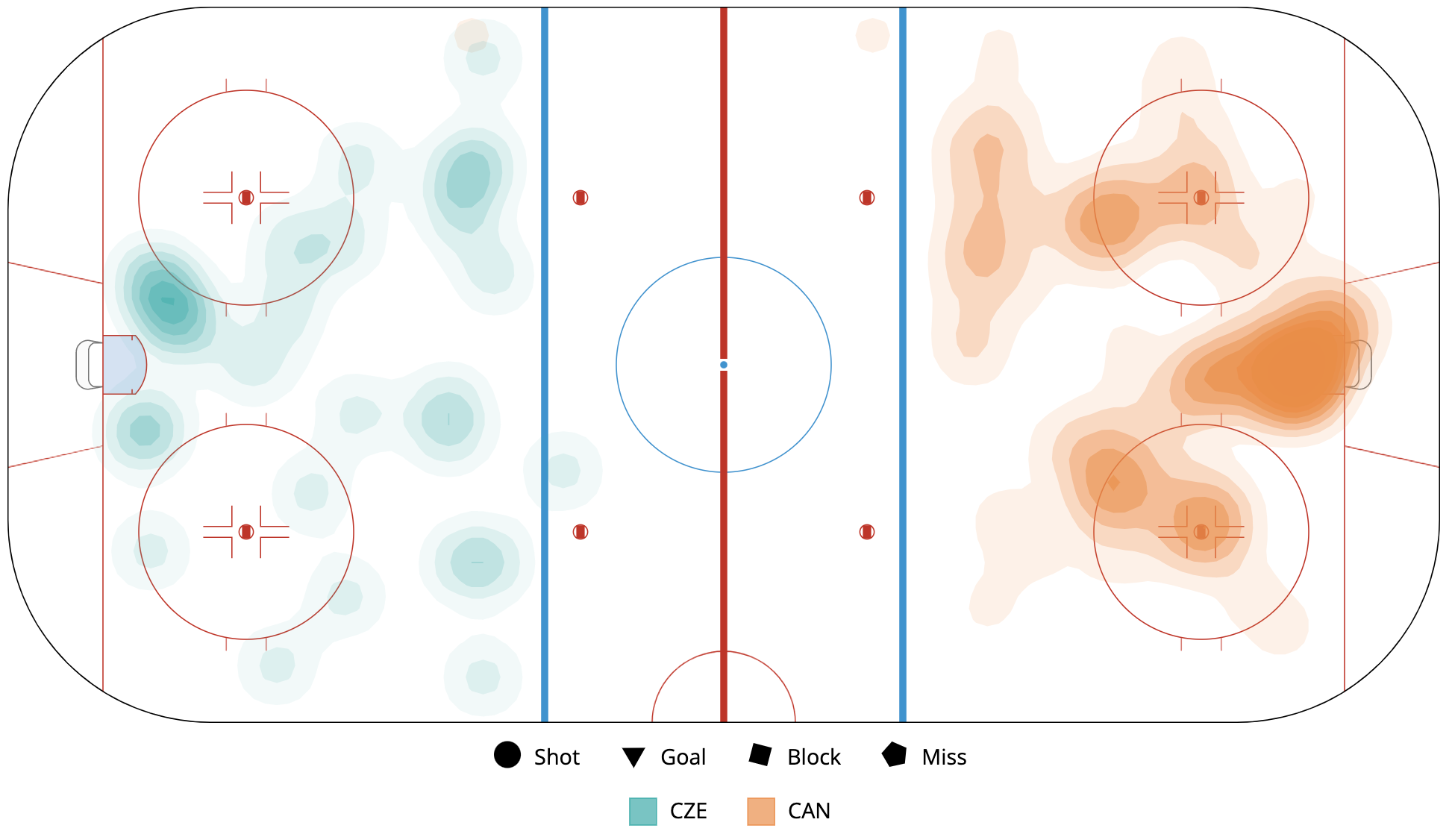 A shot attempt map for Czechia versus Canada in the 2023 Women's Worlds on April 7th, 2023.A shot attempt heat map for Czechia versus Canada in the 2023 Women's Worlds on April 7th, 2023.A shot attempt map for Czechia versus Canada, showing only the goals, in the 2023 Women's Worlds on April 7th, 2023.A time on ice breakdown Sankey chart for Czechia against Canada in the 2023 Women's Worlds on April 7th, 2023.A time on ice breakdown Sankey chart for Czechia against Canada in the 2023 Women's Worlds on April 7th, 2023.