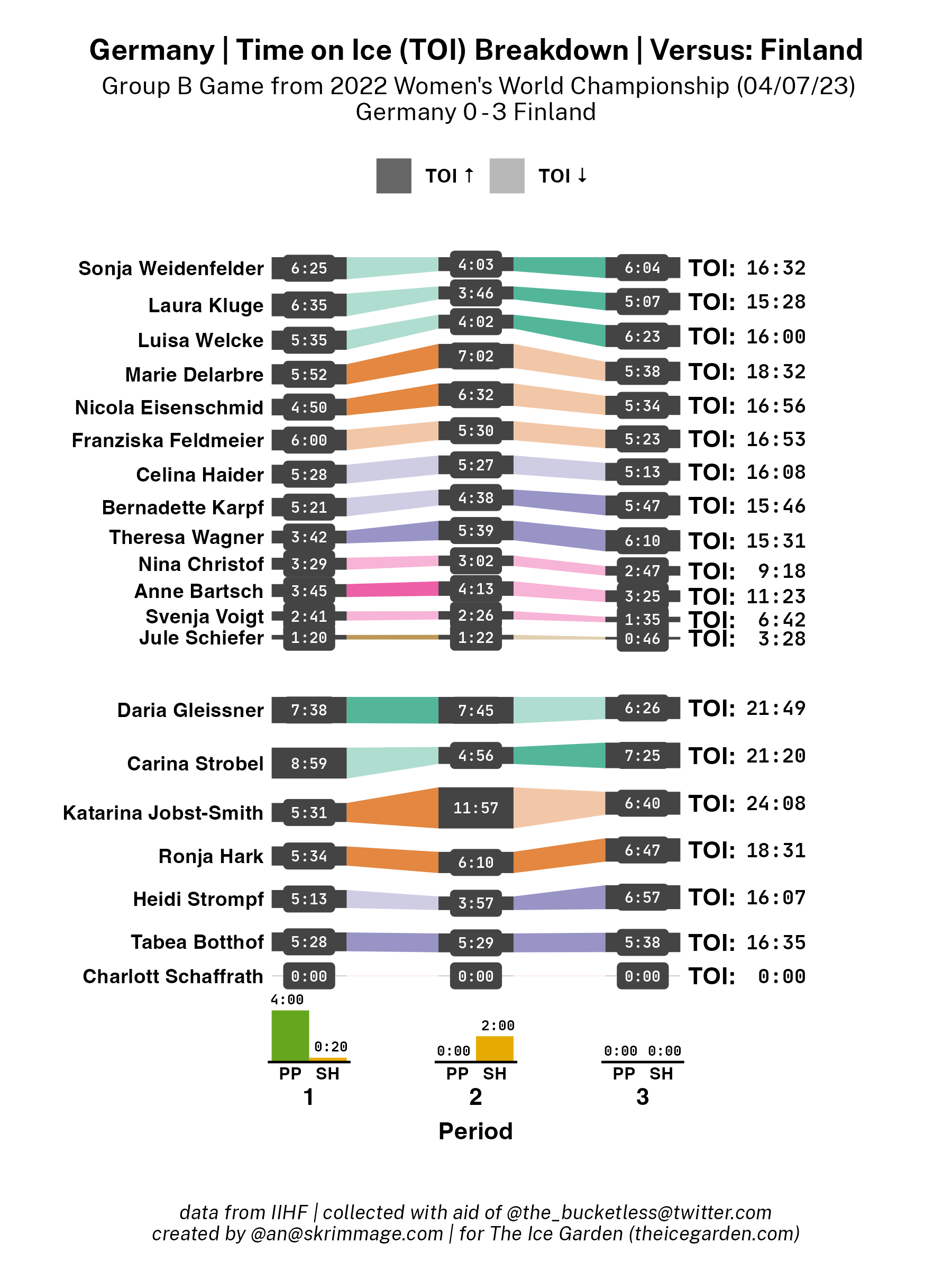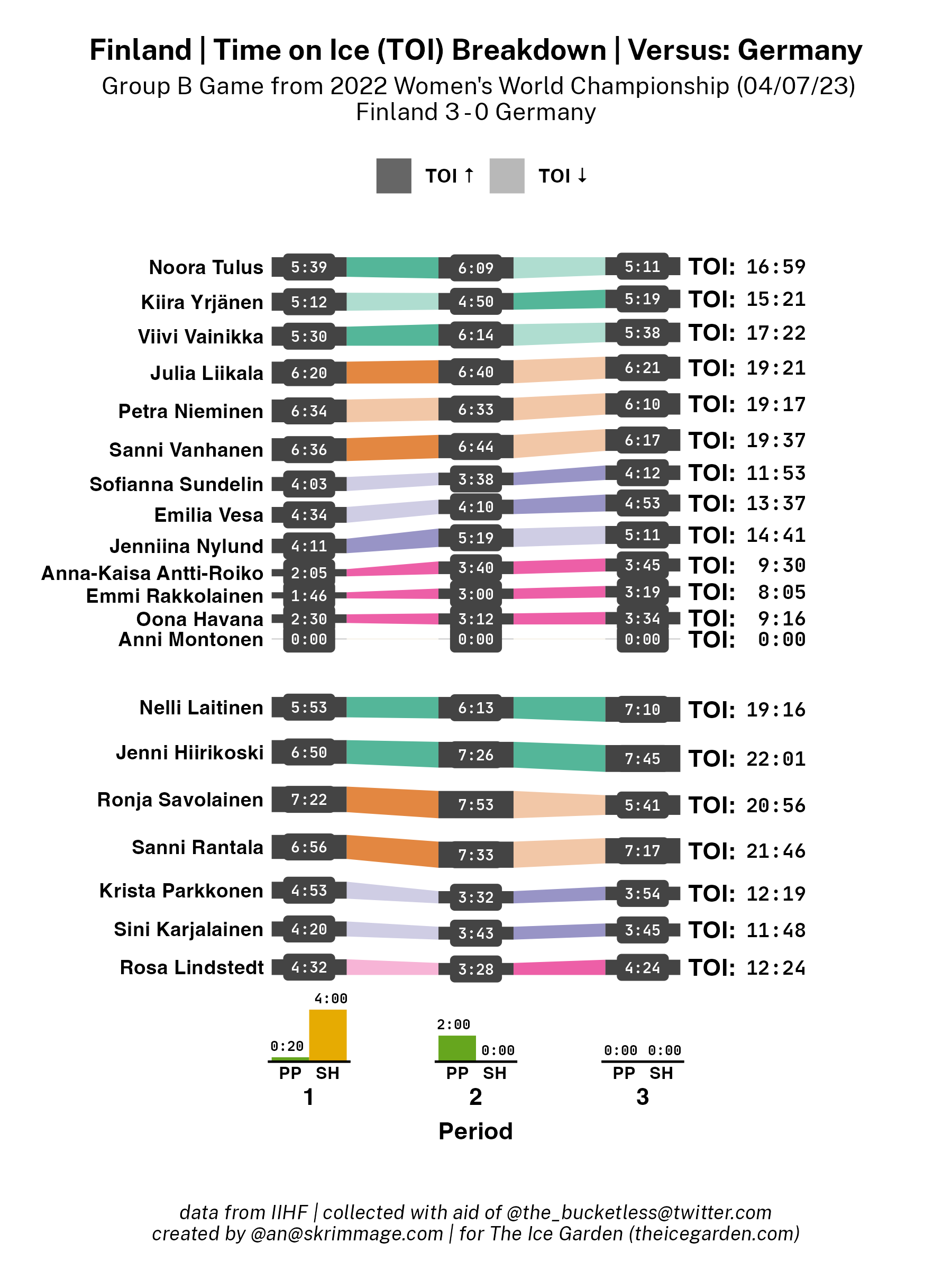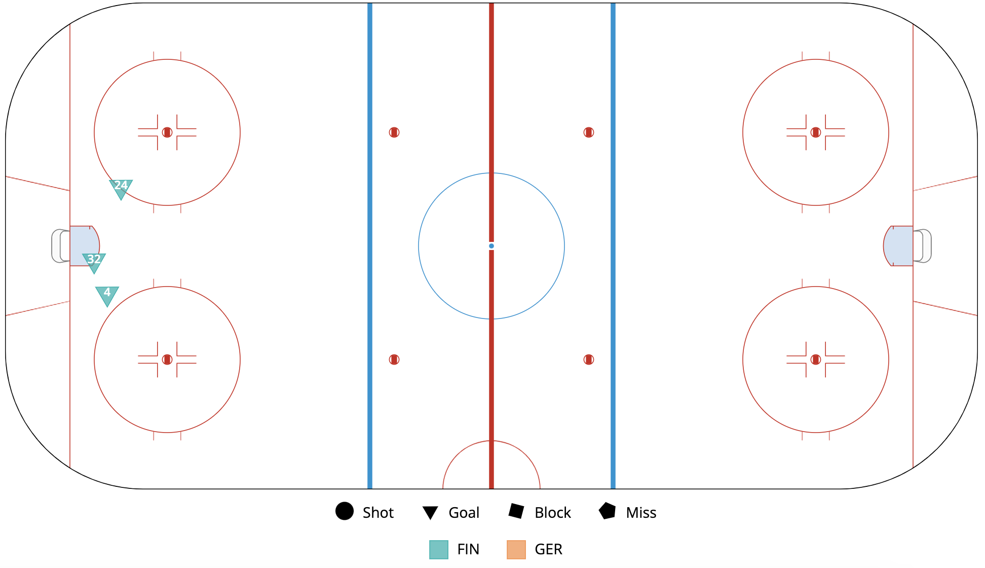A shot attempt map for Finland versus Germany in the 2023 Women's Worlds on April 7th, 2023.A shot attempt heat map for Finland versus Germany in the 2023 Women's Worlds on April 7th, 2023.A shot attempt map for Finland versus Germany, showing only the goals, in the 2023 Women's Worlds on April 7th, 2023.A time on ice breakdown Sankey chart for Finland against Germany in the 2023 Women's Worlds on April 7th, 2023.A time on ice breakdown Sankey chart for Germany against Finland in the 2023 Women's Worlds on April 7th, 2023.