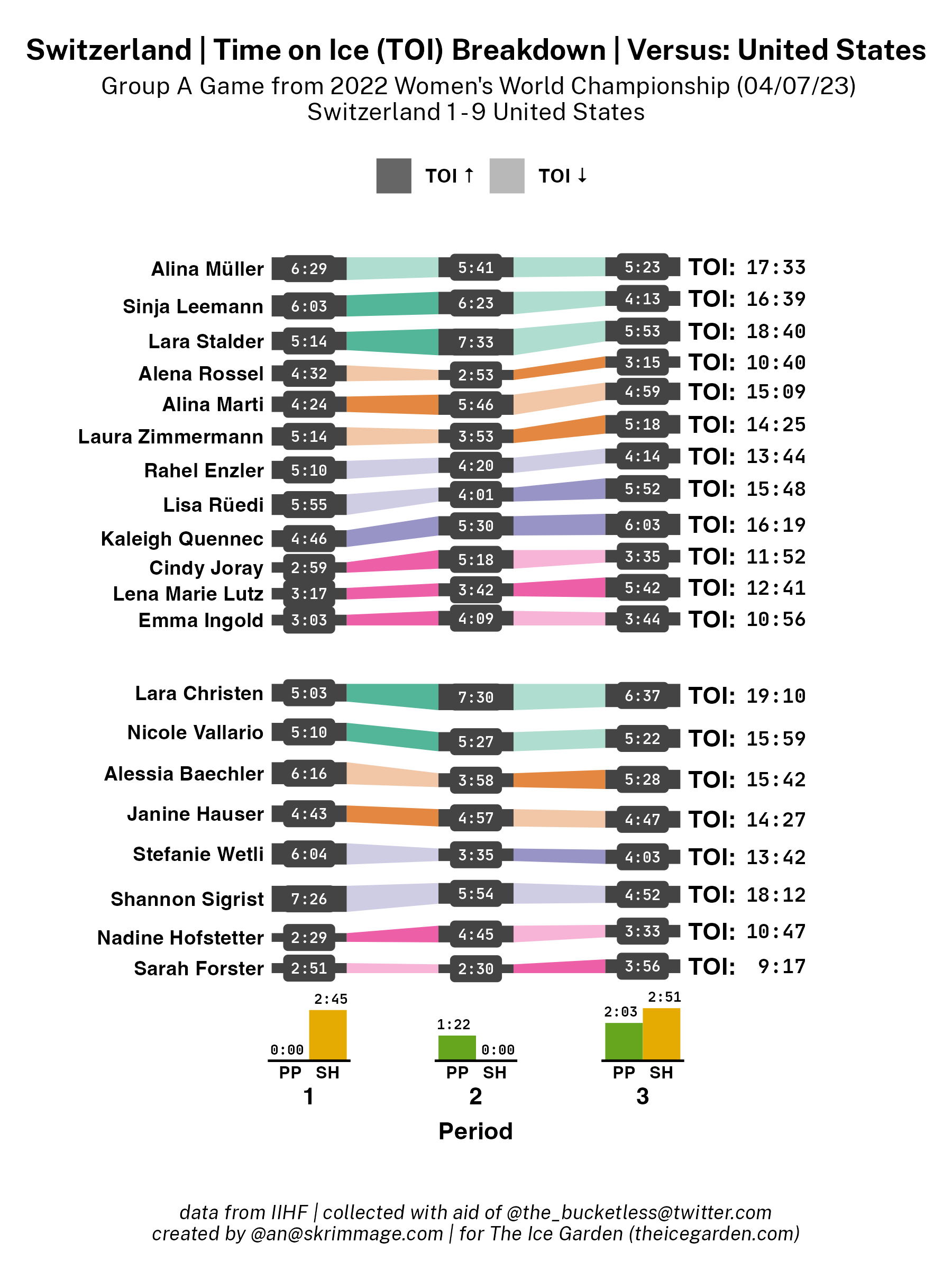 A shot attempt map for Switzerland versus the United States in the 2023 Women's Worlds on April 7th, 2023.A shot attempt heat map for Switzerland versus the United States in the 2023 Women's Worlds on April 7th, 2023.A shot attempt map for Switzerland versus the United States, showing only the goals, in the 2023 Women's Worlds on April 7th, 2023.A time on ice breakdown Sankey chart for Switzerland against the United States in the 2023 Women's Worlds on April 7th, 2023.A time on ice breakdown Sankey chart for the United States against Switzerland in the 2023 Women's Worlds on April 7th, 2023.