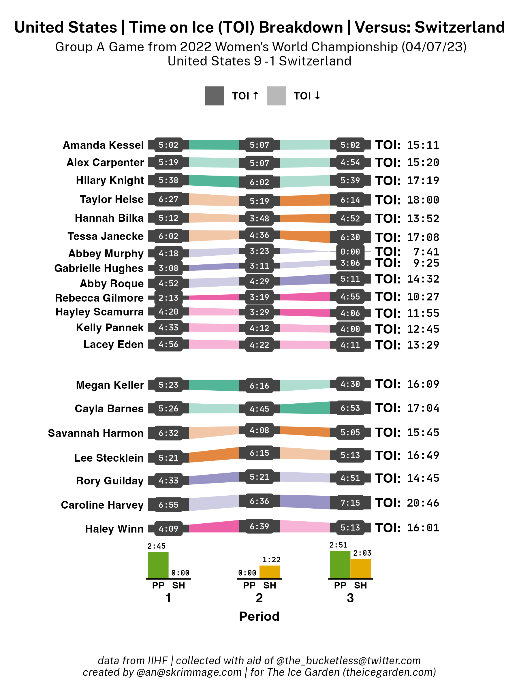 This is part of a series of recaps for every day of Women's Worlds, this one covering the games on April 7, 2023, exploring the stats of the game in data viz form (specifically: shot attempt maps with all shot attempts and with only goals, shot attempt heat maps, and time on ice breakdown Sankey charts). If you want some guidance on how to interpret these viz styles, check out my viz reference.