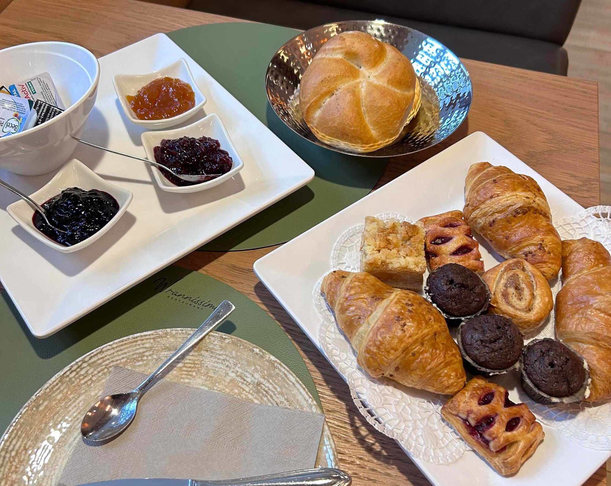 The team manager said, "what would you like, you can have anything, just tell her what you want." I didn't know anything about the hotel or what they served so I stylishly asked what they still had available and the server and manager started rapidly listing off general breakfast items like bread, jam, meats, cheese, fruit and more (again, this is all in German/broken German/broken English). Frantically, I said bread and jelly would be great, expecting to get a little plate of toast and one of those small hotel jam packets. Instead, I was given a beautiful array of their breakfast pastries and jellies. She asked if I wanted any fruit and brought out another plate of different cut fruits including kiwis, melons, and grapes. I was so stunned I forgot to take another picture with all the fruit!