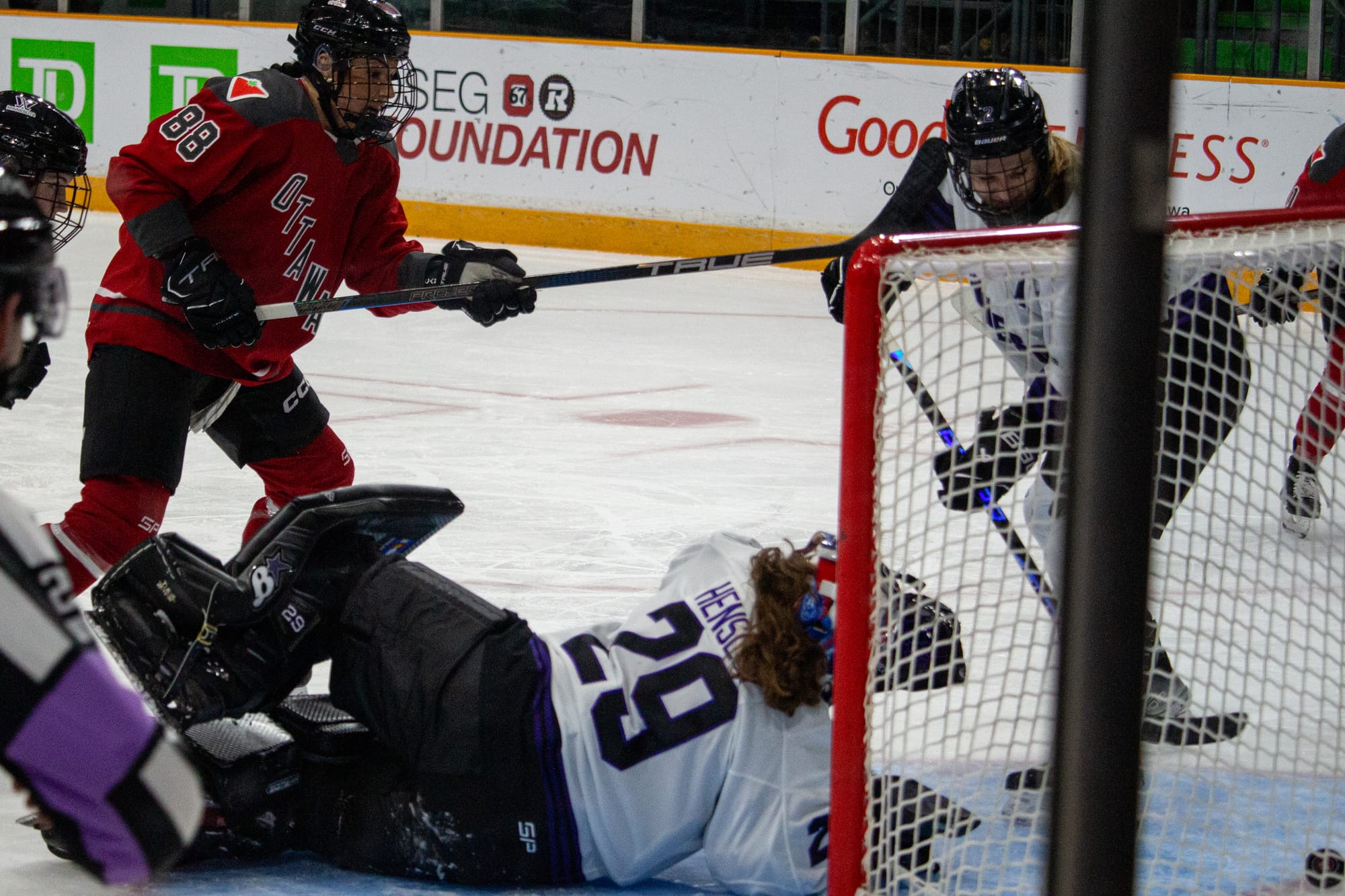 The whole arena held its breath two minutes later when Gabbie Hughes nearly retook the lead while in alone on the Ottawa net. She had a second chance moments later when Hensley made a huge error, leaving her net and coughing up the puck. Hughes stretched to put the puck in the empty net, but a diving Hensley made the goal-line save.