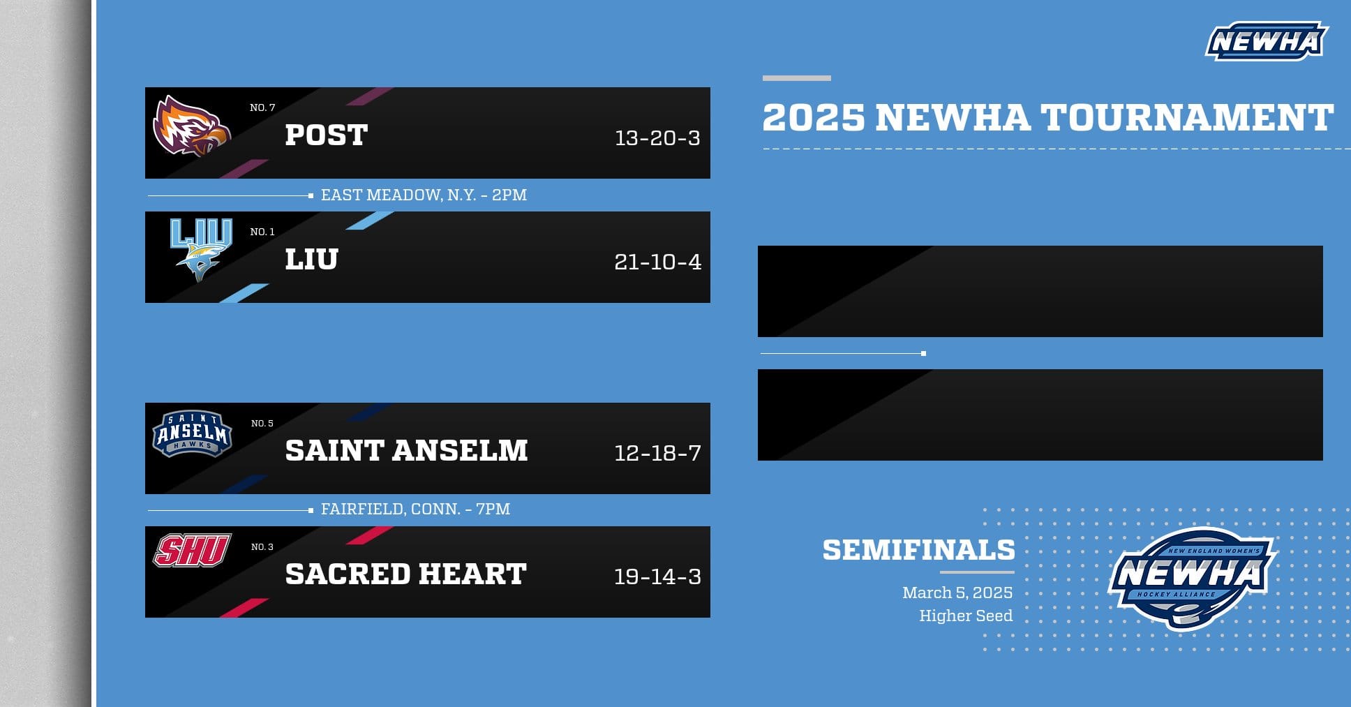 Post's hot run continues, but in their way is No. 1 LIU, while the Hawks of St. Anselm head to Fairfield to take on Sacred Heart in the 2025 NEWHA semifinals.