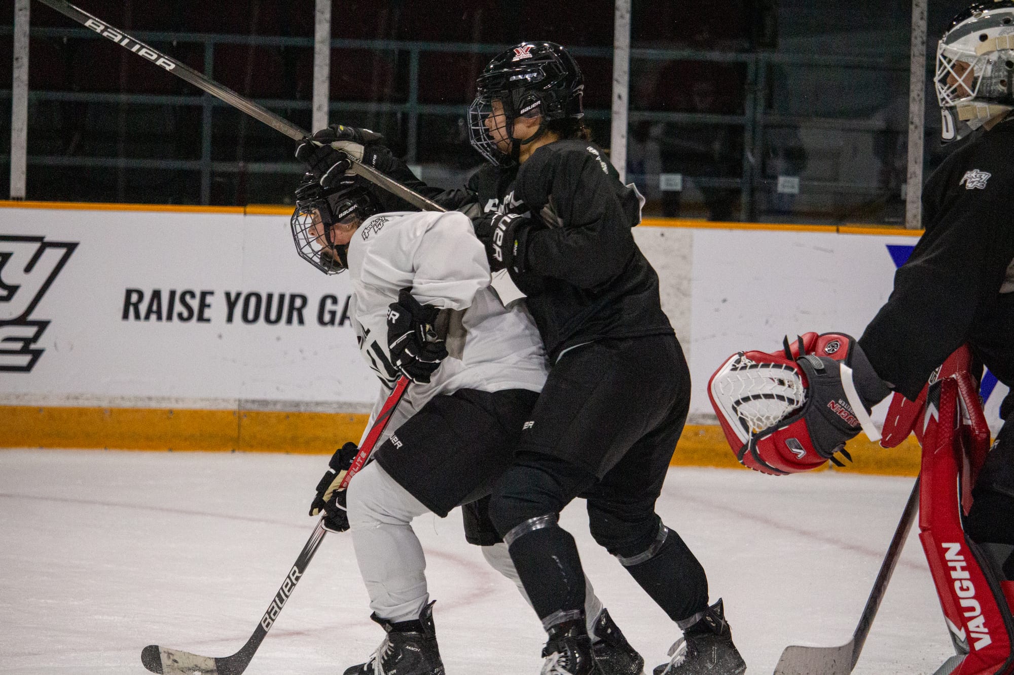 At practice on Thursday, the team practiced screens in front of the net. Players took turns placing their bodies in front of the goalies to inhibit their ability to see and stop the puck.