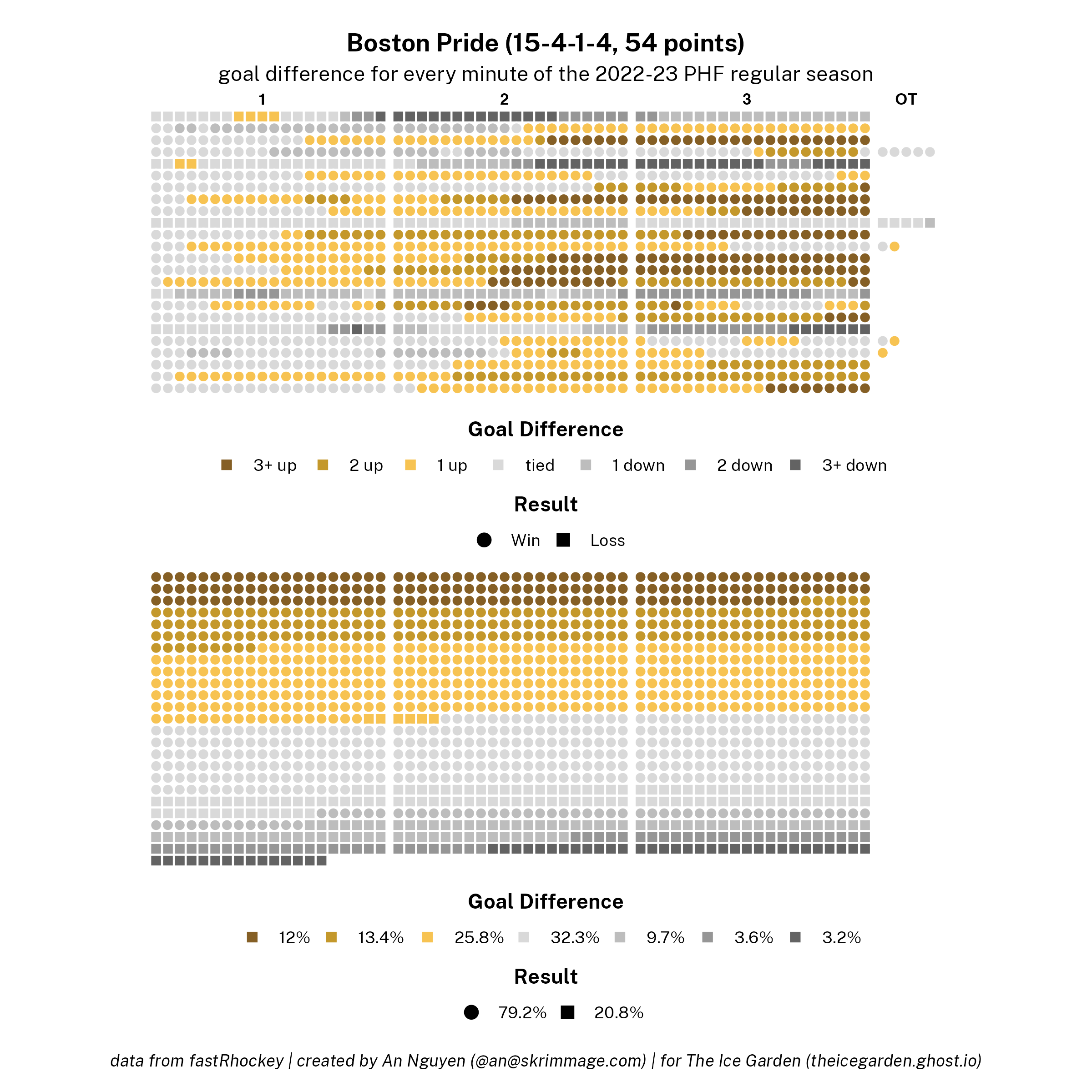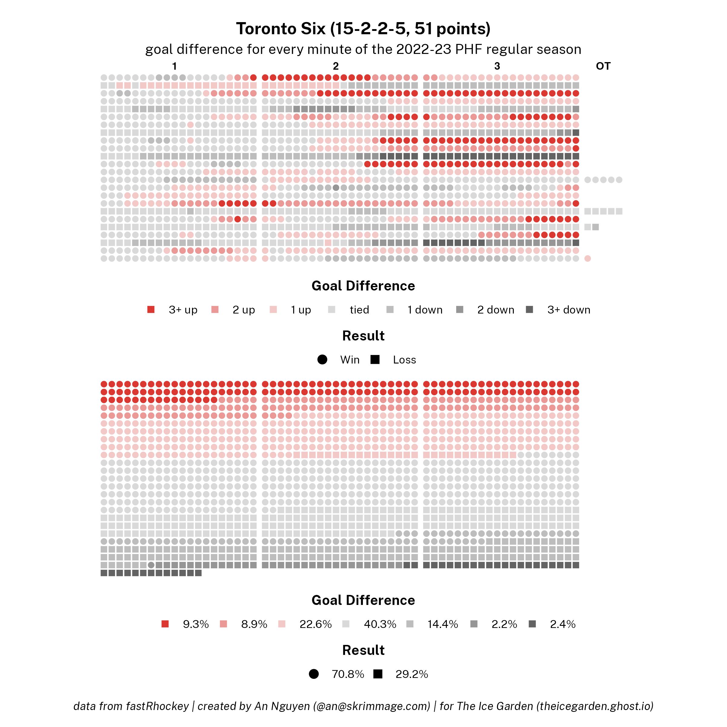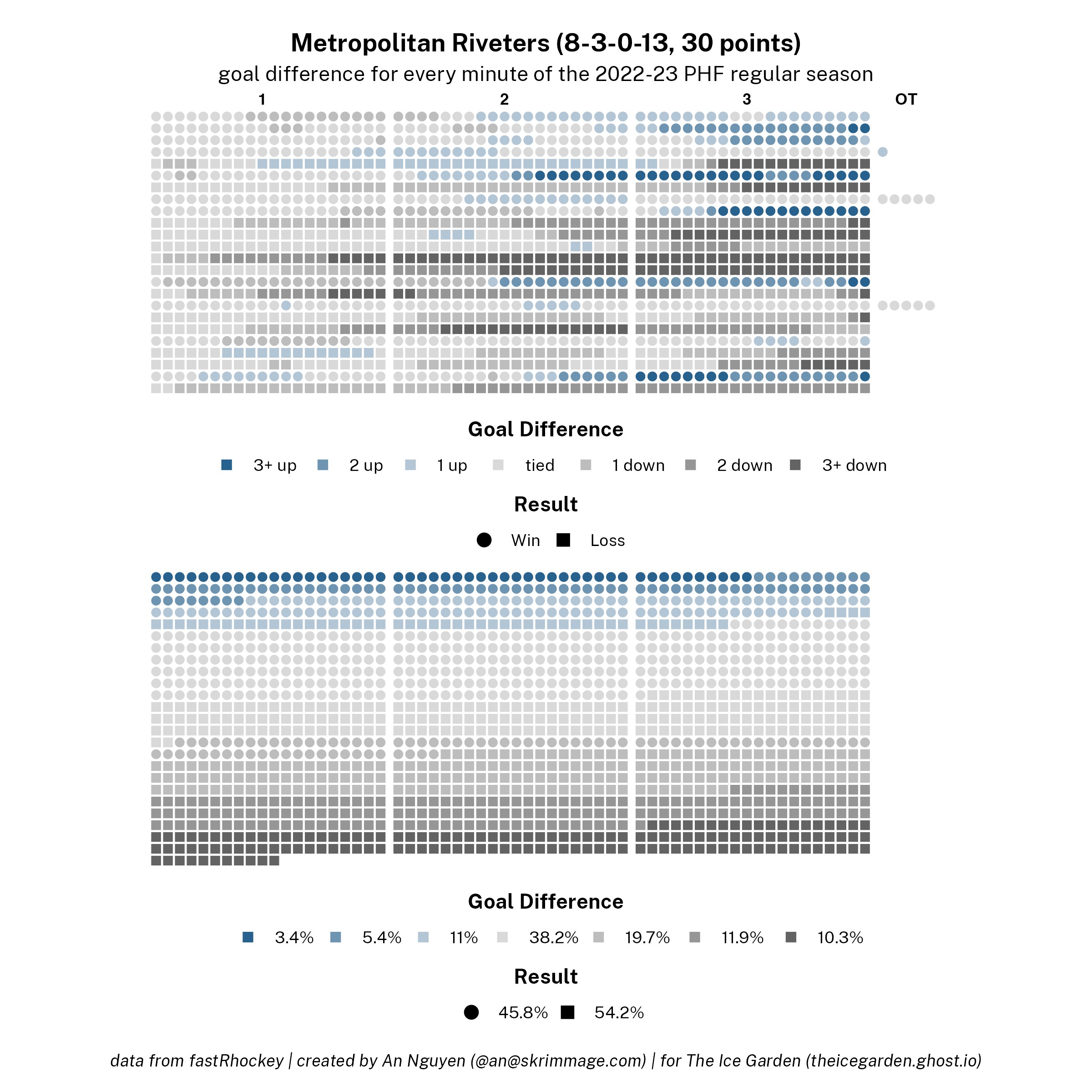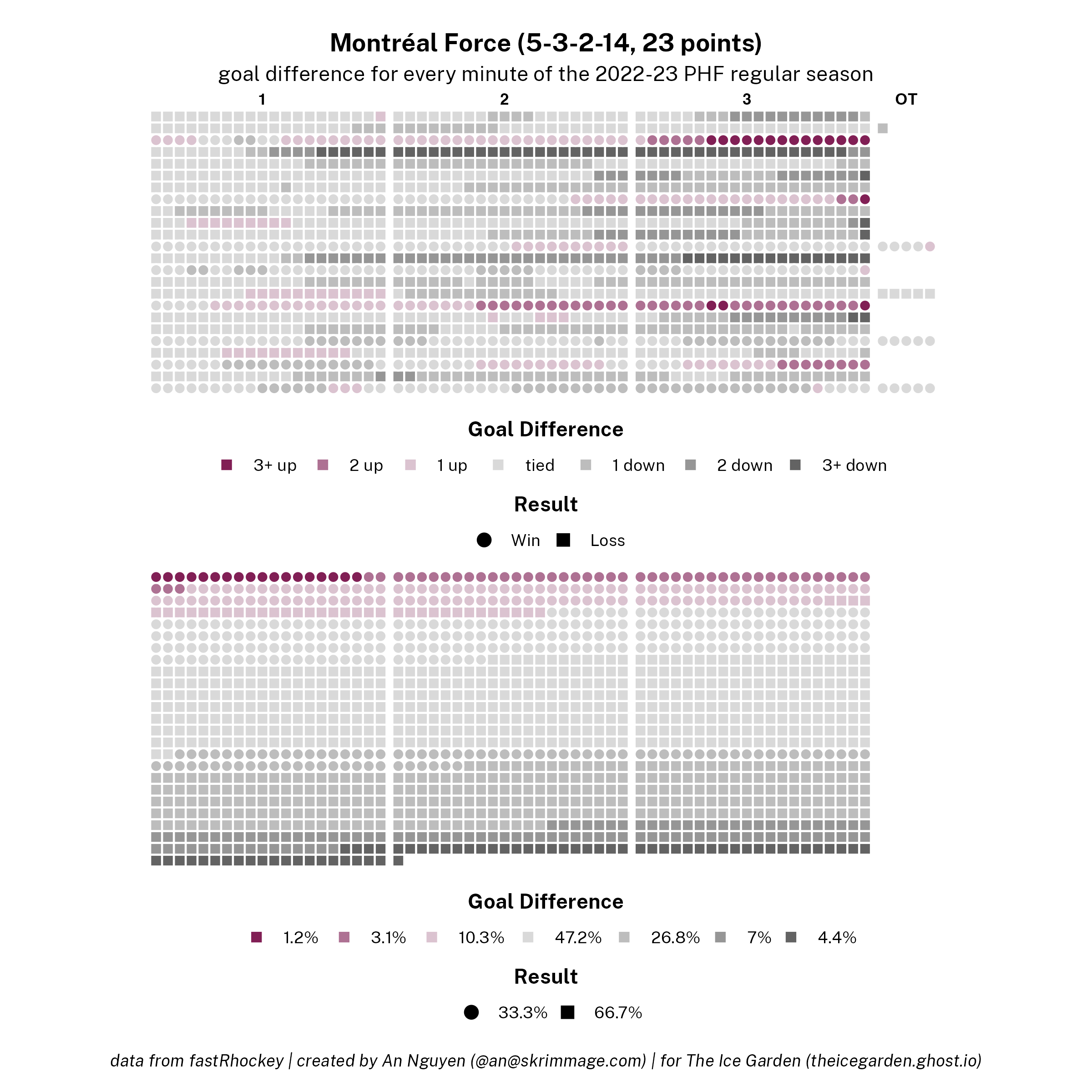 The 2022-23 PHF regular season promised a lot of excitement, what with the raised salary cap and the awaited addition of a seventh team in the Montréal Force. We at The Ice Garden have published a season recap for every single team, that you can and should check out (instead of asking me how long I spent counting on my fingers to find an appropriate seven word phrase), but I wanted to take a look back at the season through my lens of expertise — data visualizations! These data viz look at some of the stats of the season for each team, focusing on whether the team led or lagged on the scoreboard during games, who was involved with the team's goals, and the performance of the team's goalies in comparison with one another and across the league. For more information on how to interpret these visualizations, check out my data viz reference.