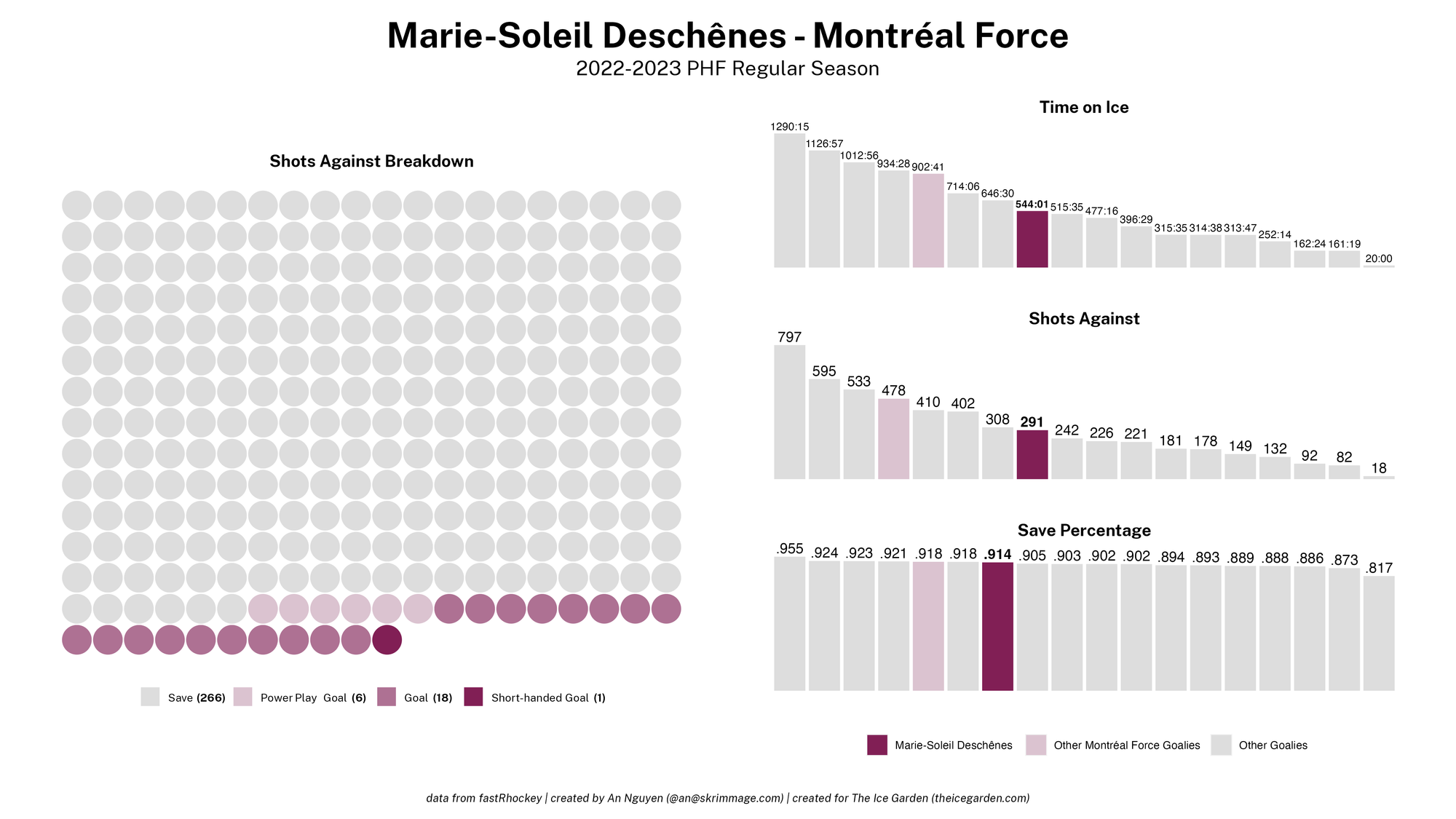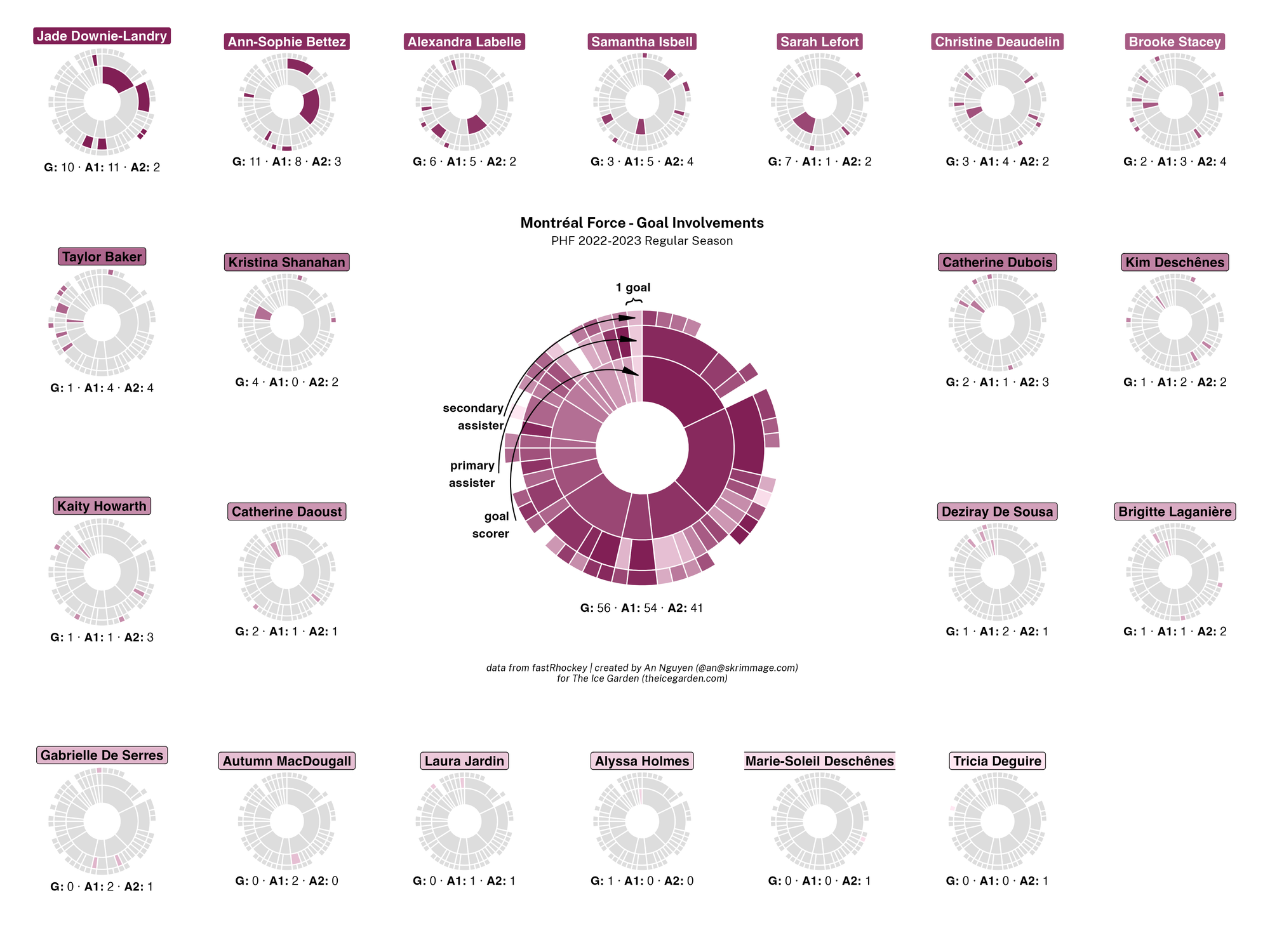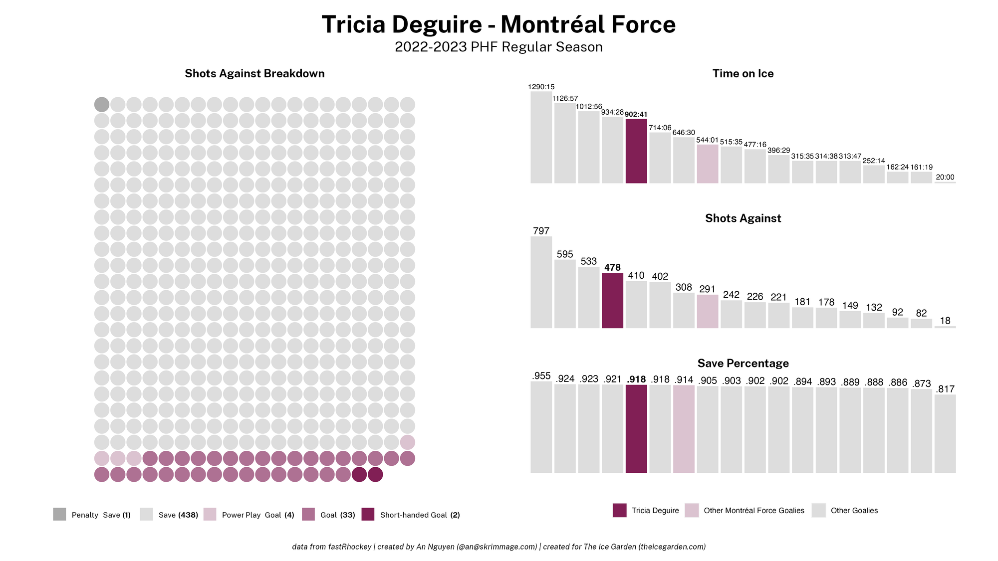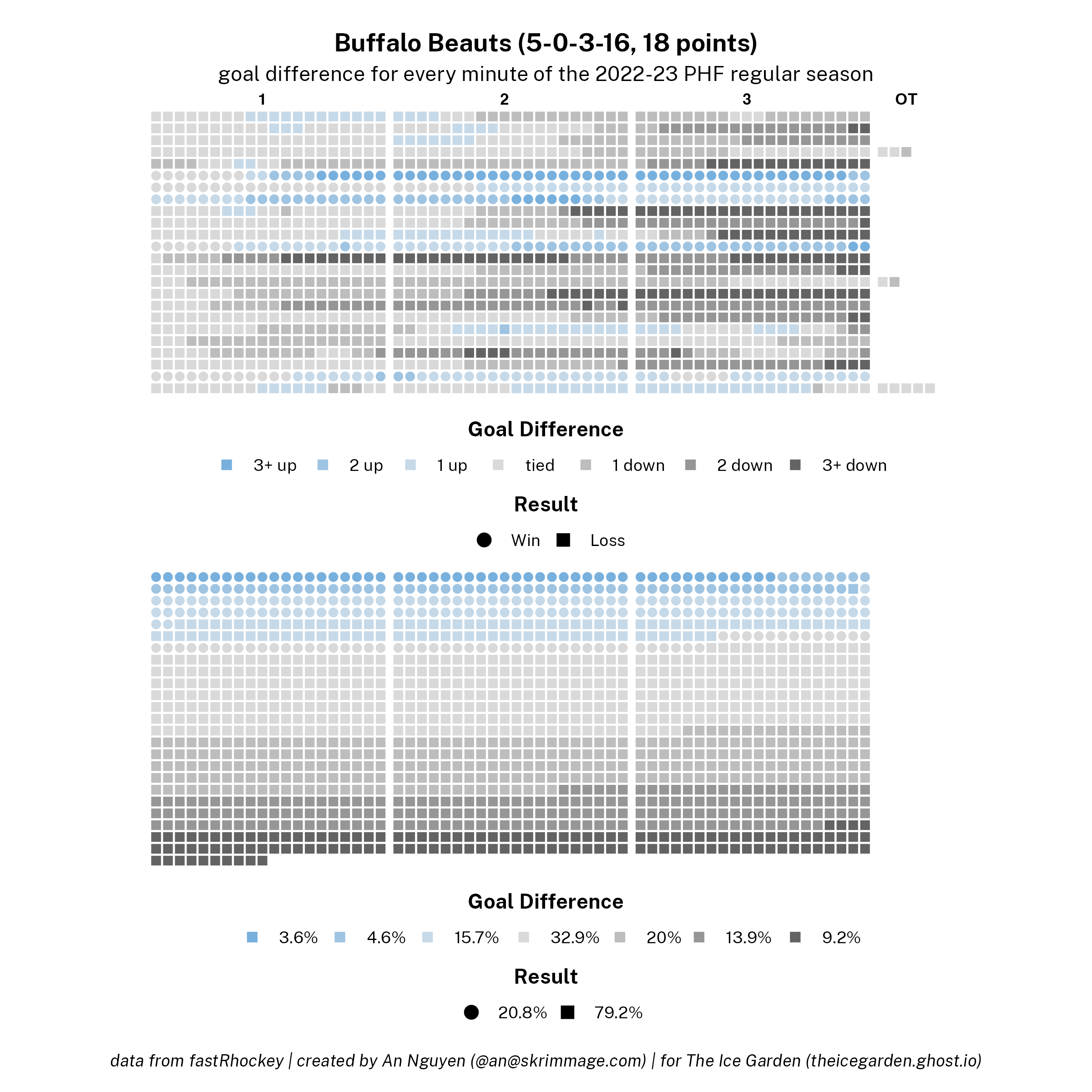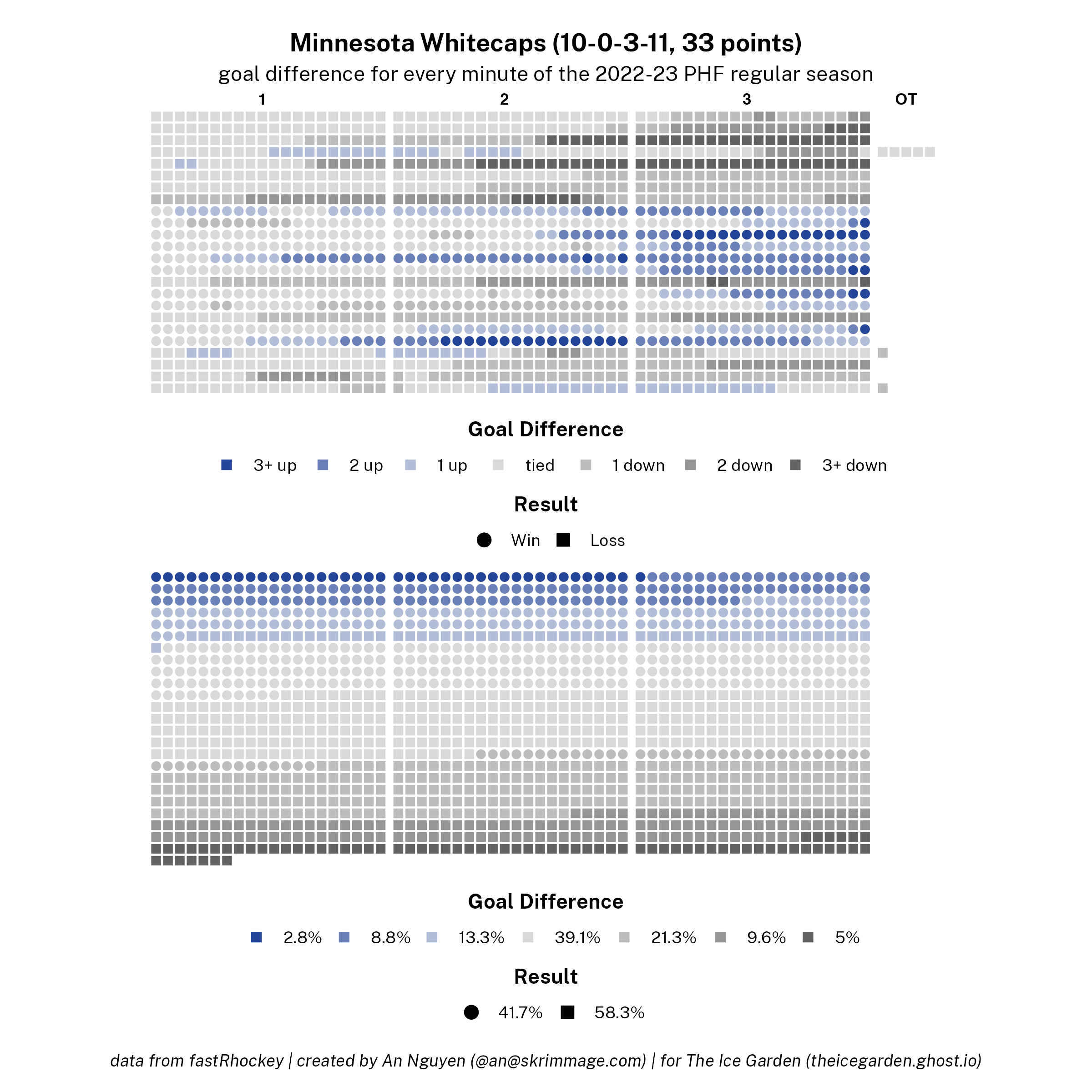 The 2022-23 PHF regular season promised a lot of excitement, what with the raised salary cap and the awaited addition of a seventh team in the Montréal Force. We at The Ice Garden have published a season recap for every single team, that you can and should check out (instead of asking me how long I spent counting on my fingers to find an appropriate seven word phrase), but I wanted to take a look back at the season through my lens of expertise — data visualizations! These data viz look at some of the stats of the season for each team, focusing on whether the team led or lagged on the scoreboard during games, who was involved with the team's goals, and the performance of the team's goalies in comparison with one another and across the league. For more information on how to interpret these visualizations, check out my data viz reference.