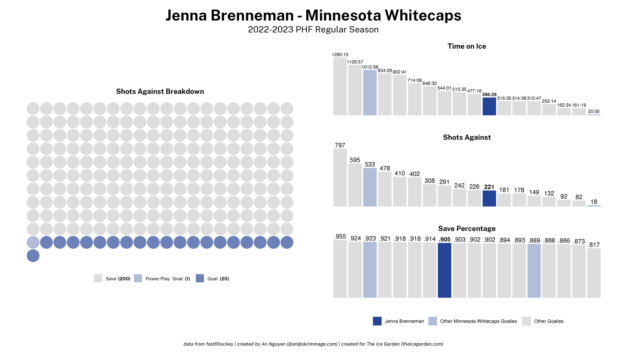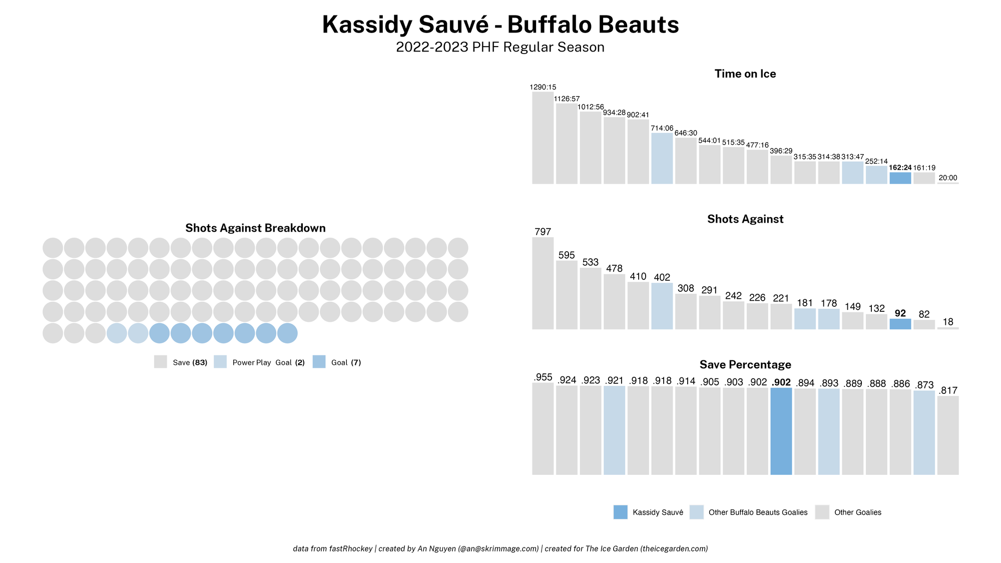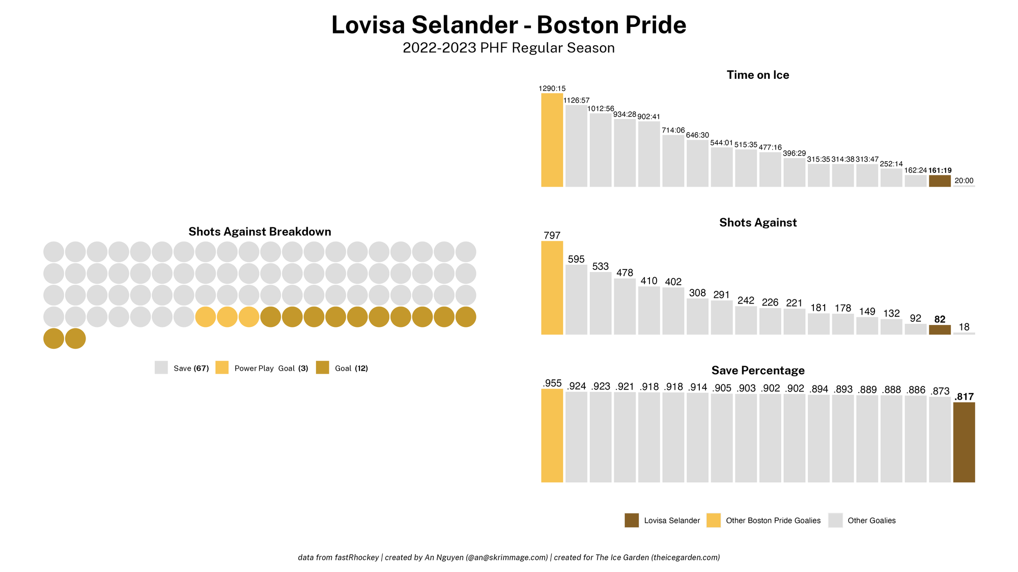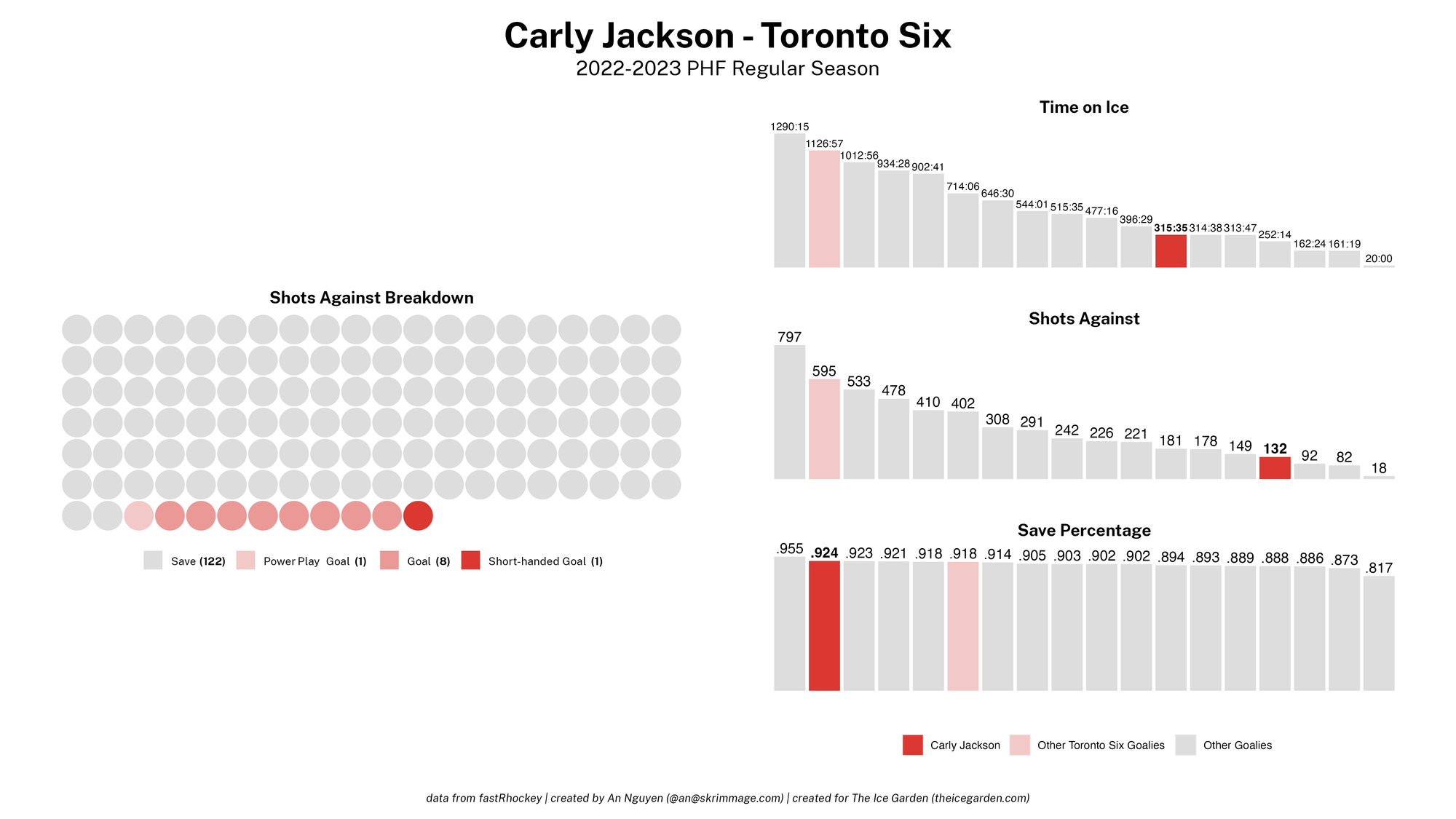 The 2022-23 PHF regular season promised a lot of excitement, what with the raised salary cap and the awaited addition of a seventh team in the Montréal Force. We at The Ice Garden have published a season recap for every single team, that you can and should check out (instead of asking me how long I spent counting on my fingers to find an appropriate seven word phrase), but I wanted to take a look back at the season through my lens of expertise — data visualizations! These data viz look at some of the stats of the season for each team, focusing on whether the team led or lagged on the scoreboard during games, who was involved with the team's goals, and the performance of the team's goalies in comparison with one another and across the league. For more information on how to interpret these visualizations, check out my data viz reference.
