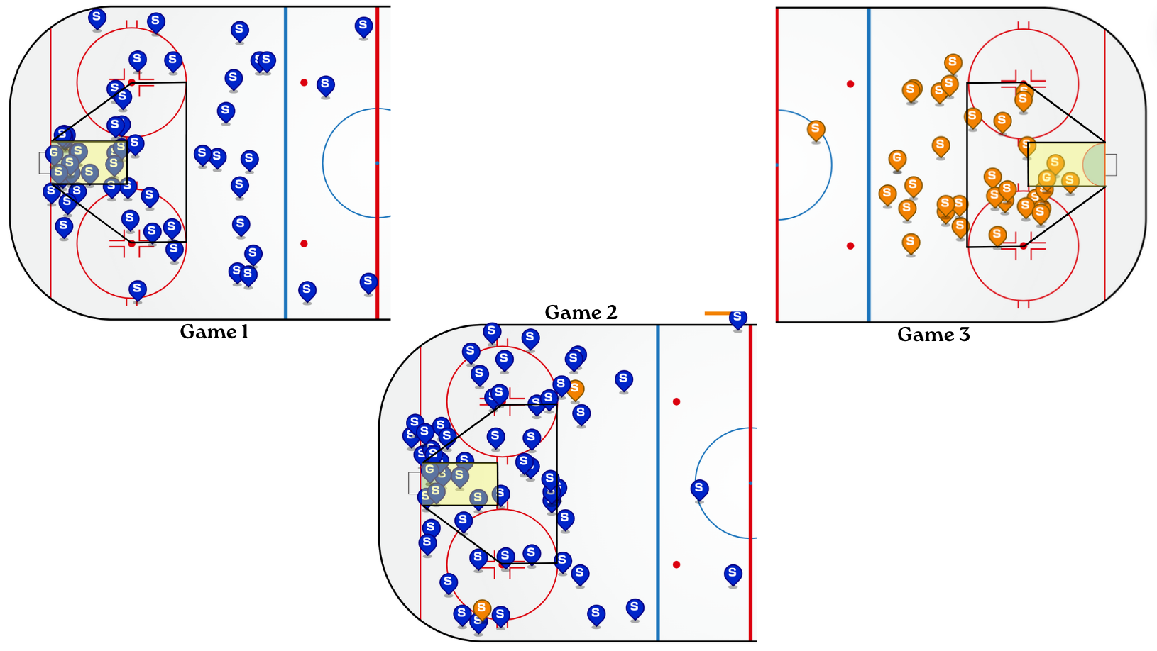 In total, 67 of the shots she faced (46%) were from inside the house (the black outlined area, considered the danger area), and many others were from just outside it. Further, 17 of those 67 were from inside the slot (the yellow outlined area, considered the high-danger area). She made numerous game-saving stops throughout the series, and without her, Boston may have been the swept team.