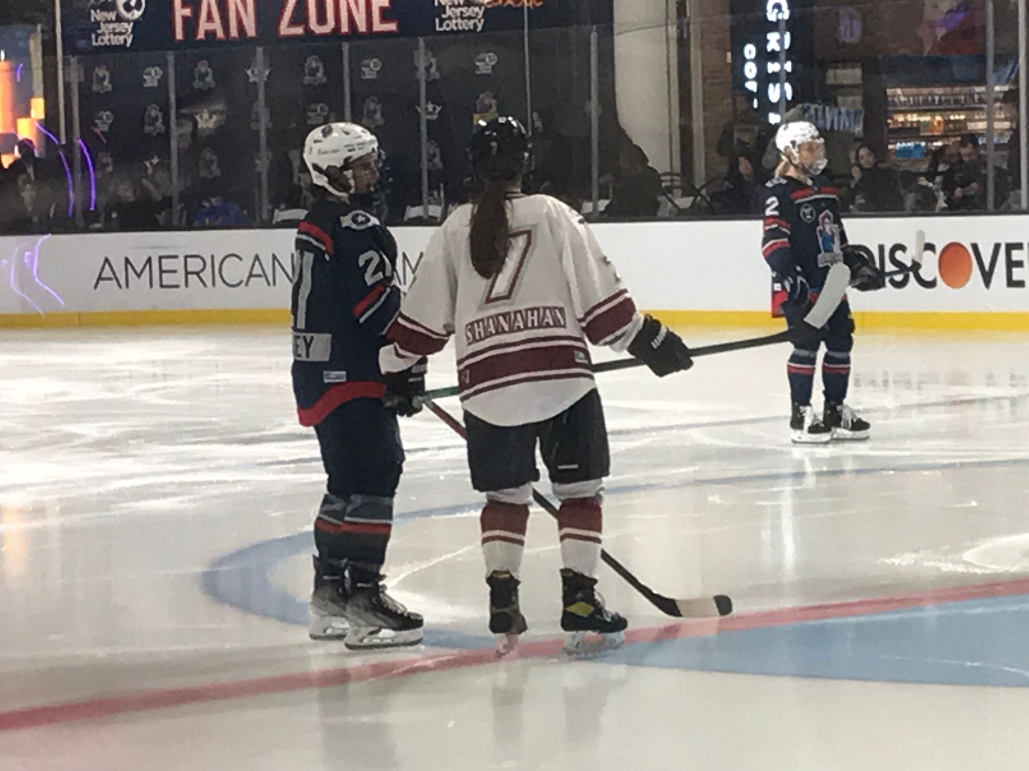 KS: “I think it took us the first period to adjust, we got back in the locker room and felt like we were okay after a while. Especially coming out for warmups, there’s a lot going on. It’s a really fun atmosphere to play in. You have a lot of people watching, people coming and going in a mall. During warmups, I saw a lot of people filming us, probably because they’d never seen women’s hockey before. It was fun and the ice was better than expected - we all said that.”