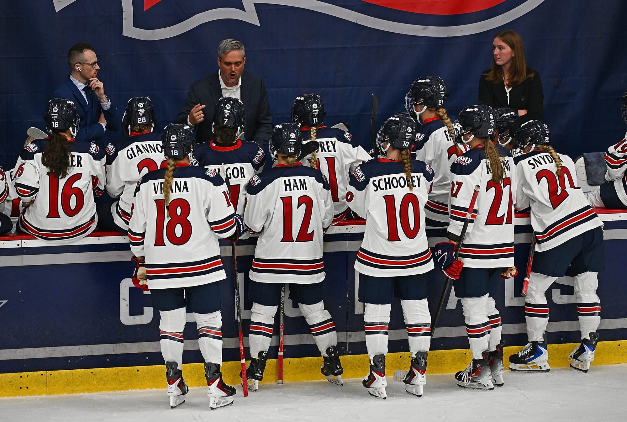 CLOUGHERTY: I don't know if people realize how much goes on on the coaching side, it's not just drawing up – not that I thought it was, but it's definitely a lot. I've definitely found a good routine. I love being at the rink. So, I kind of spend as much time as I can here… watching practice back, planning practice, doing some work [to] prep for the weekend, also just checking in on our players and academics and all of that stuff and going off like why I wanted to be here. The girls on our team are so involved in the community, so it's helping them find ideas. There's definitely a lot of moving pieces that if you don't love it and love being at the rink, then you're probably in the wrong spot. Sometimes I don't even realize what time it is and I'm like, oh my gosh, I've been here for so long, but it means I like what I'm doing.