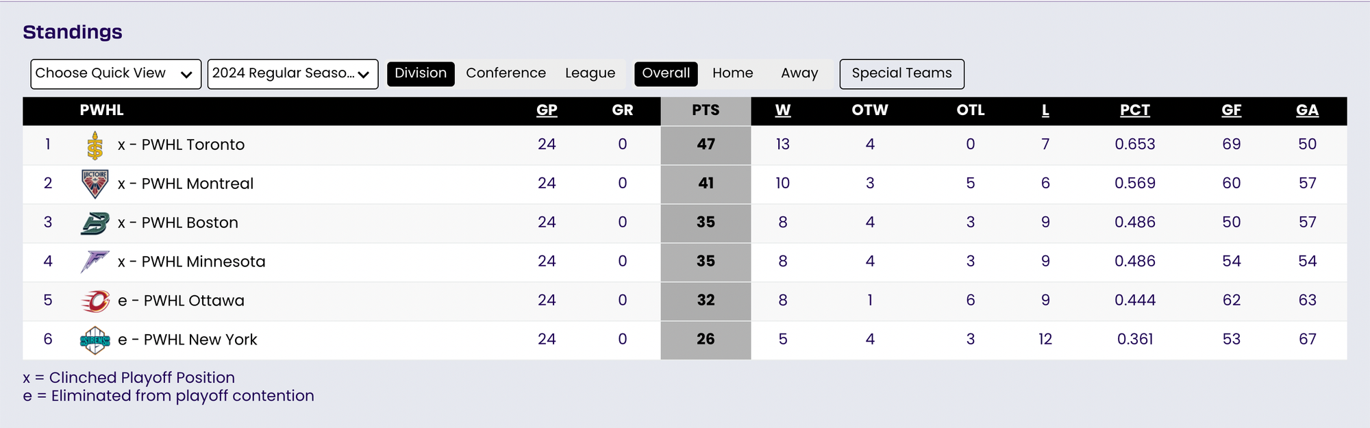 The PWHL is comprised of six teams (oh yeah, and the PWHL? It stands for Professional Women's Hockey League): The Minnesota Frost, the Boston Fleet, the Toronto Sceptres, the Montréal Victoire, the Ottawa Charge, and the New York Sirens.