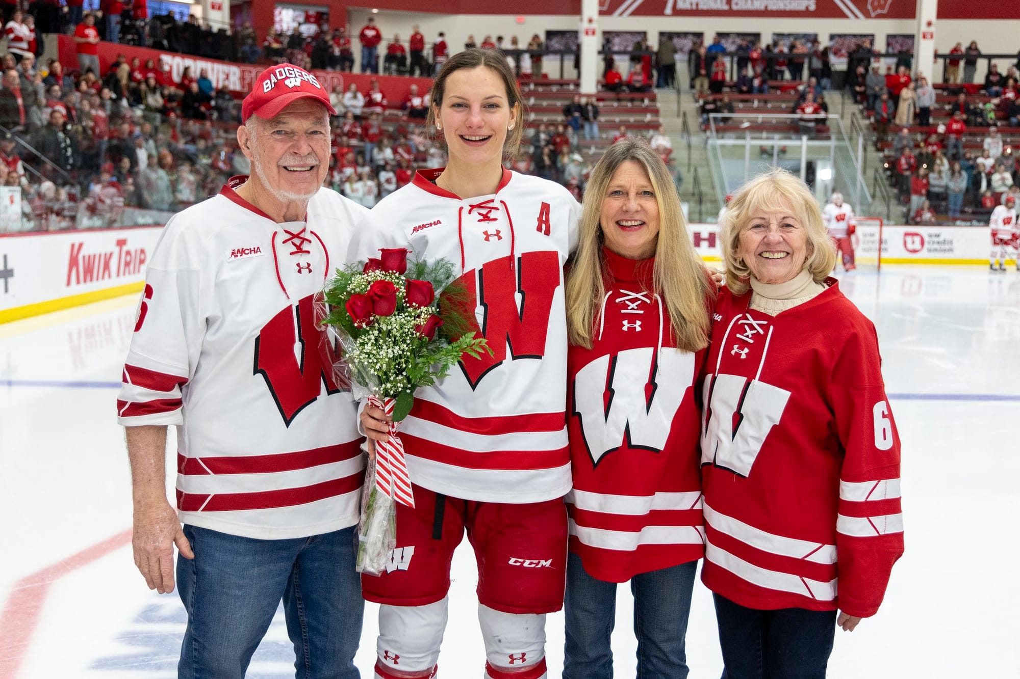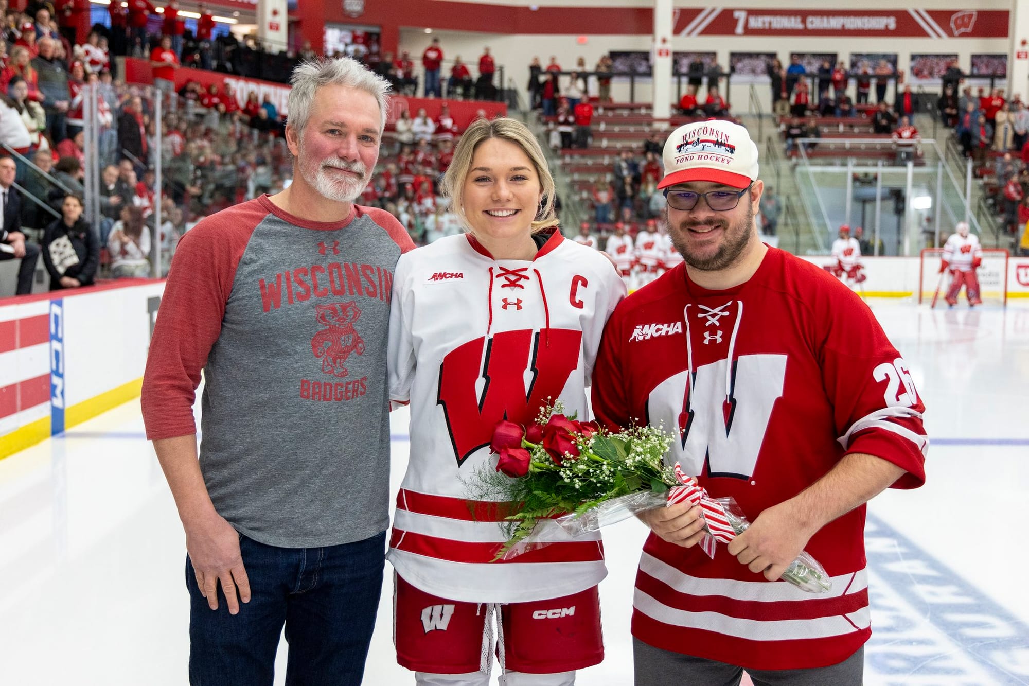 Top: Wisconsin' Casey O'Brien and her family (left) and Lacey Eden with her family (right) photos via BadgerWHockey on X | Bottom: St. Cloud State's senior class, and Emma Gentry during her senior ceremony. Photo credit: Jason Soria via SCSU Athletics